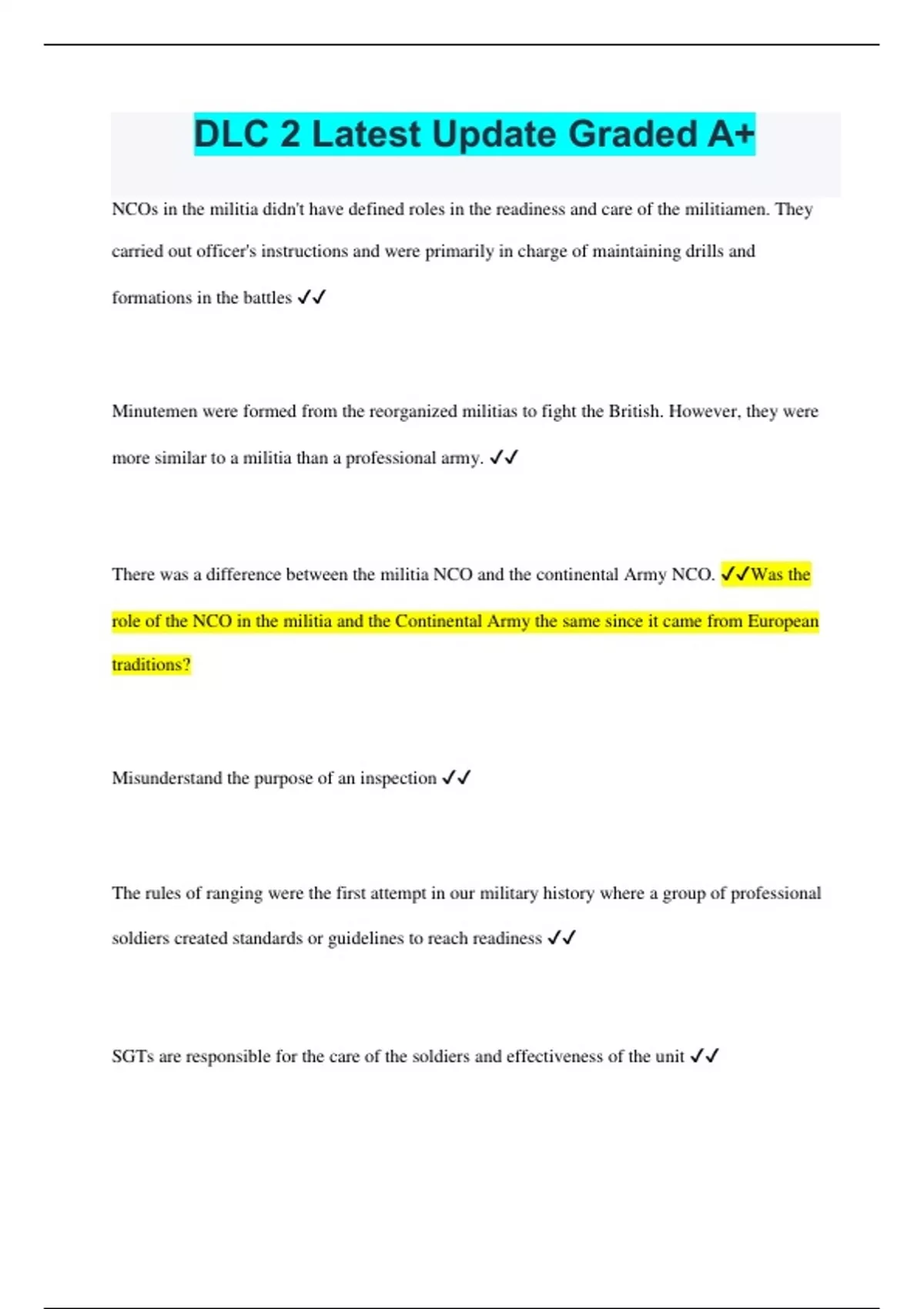DLC 2 Latest Update Graded A+ NCOs in the militia didn't have defined roles in the readiness and care of the militiamen. They carried out officer's instructions and were primarily in charge of maintaining drills and formations in the battles Minutemen were formed from the reorganized militias to fight the British. However, they were more similar to a militia than a professional army. There was a difference between the militia NCO and the continental Army NCO. Was the role of the NCO in the militia and the Continental Army the same since it came from European traditions? Misunderstand the purpose of an inspection The rules of ranging were the first attempt in our military history where a group of professional soldiers created standards or guidelines to reach readiness SGTs are responsible for the care of the soldiers and effectiveness of the unit Von steuben created the blue book which defined the roles and respobsiles of the NCOS and he changed the marching formation and firing efficiency of the Contential