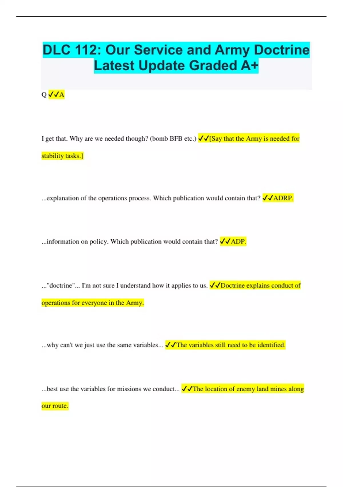 DLC 112: Our Service and Army Doctrine Latest Update Graded A+ Q A I get that. Why are we needed though? (bomb BFB etc.) [Say that the Army is needed for stability tasks.] ...explanation of the operations process. Which publication would contain that? ADRP. ...information on policy. Which publication would contain that? ADP. ..."doctrine"... I'm not sure I understand how it applies to us. Doctrine explains conduct of operations for everyone in the Army. ...why can't we just use the same variables... The variables still need to be identified. ...best use the variables for missions we conduct... The location of enemy land mines along our route. ...operational variable? The capabilities of the Japanese Self Defense Force (JSDF). ...What's our purpose? Our effectiveness depends on us managing populations and civilians. ...Who's gonna listen to me? Knowing your