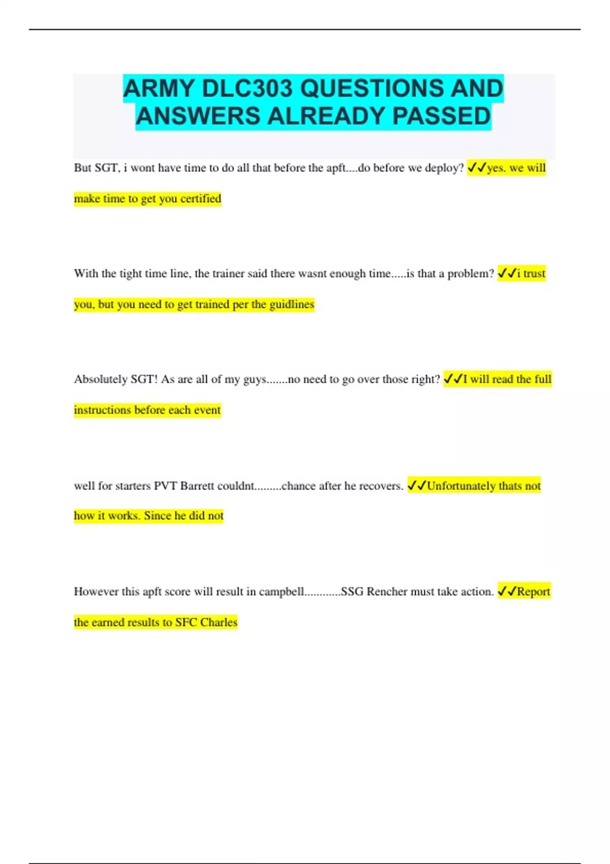 ARMY DLC303 QUESTIONS AND ANSWERS ALREADY PASSED But SGT, i wont have time to do all that before the apft....do before we deploy? yes. we will make time to get you certified With the tight time line, the trainer said there wasnt enough time.....is that a problem? i trust you, but you need to get trained per the guidlines Absolutely SGT! As are all of my guys.......no need to go over those right? I will read the full instructions before each event well for starters PVT Barrett couldnt.........chance after he recovers. Unfortunately thats not how it works. Since he did not However this apft score will result in campbell............SSG Rencher must take action. Report the earned results to SFC Charles