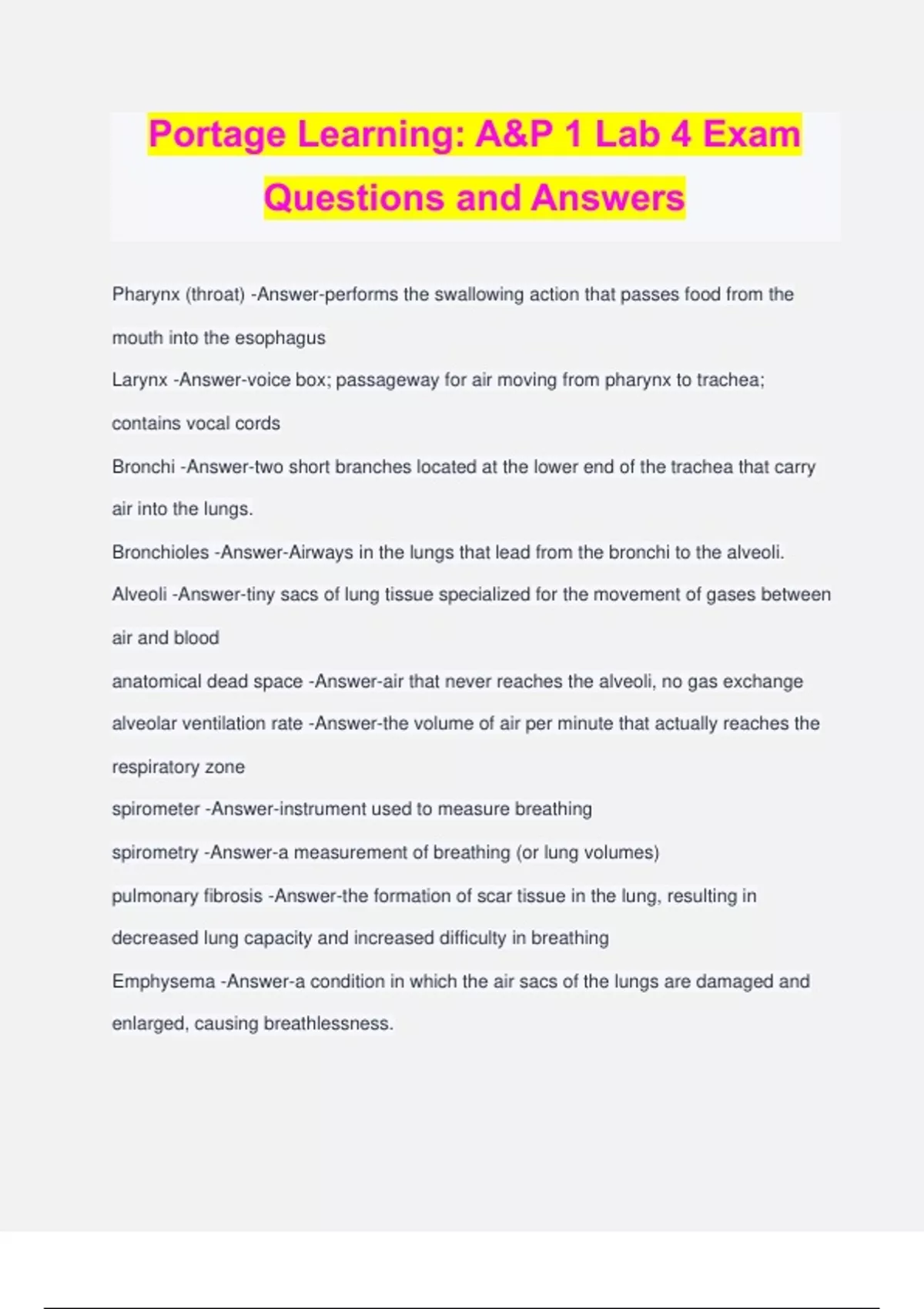 Portage Learning: A&P 1 Lab 4 Exam Questions and Answers Pharynx (throat) -Answer-performs the swallowing action that passes food from the mouth into the esophagus Larynx -Answer-voice box; passageway for air moving from pharynx to trachea; contains vocal cords Bronchi -Answer-two short branches located at the lower end of the trachea that carry air into the lungs. Bronchioles -Answer-Airways in the lungs that lead from the bronchi to the alveoli. Alveoli -Answer-tiny sacs of lung tissue specialized for the movement of gases between air and blood anatomical dead space -Answer-air that never reaches the alveoli, no gas exchange alveolar ventilation rate -Answer-the volume of air per minute that actually reaches the respiratory zone