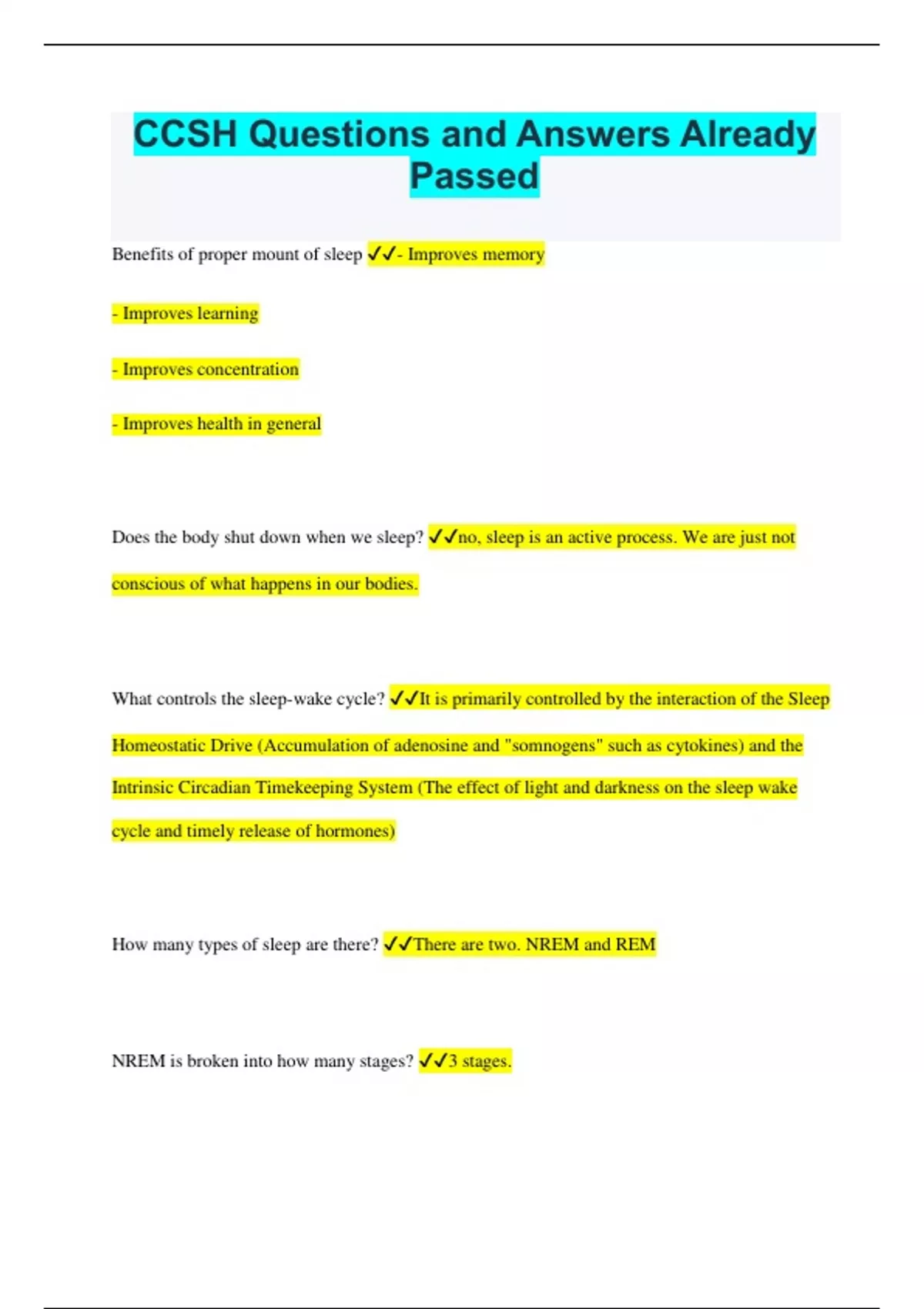 CCSH Questions and Answers Already Passed Benefits of proper mount of sleep - Improves memory - Improves learning - Improves concentration - Improves health in general Does the body shut down when we sleep? no, sleep is an active process. We are just not conscious of what happens in our bodies. What controls the sleep-wake cycle? It is primarily controlled by the interaction of the Sleep Homeostatic Drive (Accumulation of adenosine and "somnogens" such as cytokines) and the Intrinsic Circadian Timekeeping System (The effect of light and darkness on the sleep wake cycle and timely release of hormones) How many types of sleep are there? There are two. NREM and REM NREM is broken into how many stages? 3 stages. -N1 which is light sleep. Usually the first stage of sleep. - N2 still fairly light sleep and covers the majority of sleep we get during the night. - N3 Deep Sleep (AKA slow wave sleep) Physiological Variables in NREM sleep - Heart rate is regular - Respiratory rate is regular - BP is regular - Skeletal muscle tone is preserved - Brain O2 consumption is reduced. - Response to CO2 is the same as wake - Response to O2 is the same as W - Penile tumescence, vaginal engorgement is infrequent - Temperature is homeothermic Homeothermic having a body temperature that is constant and largely independent of the temperature of its surroundings. Stable body temperature of about 98.6F/ 37 C Physiological variables during REM sleep - Heart rate is irregular - Respiratory Rate is irregular - Blood Pressure is variable - Skeletal muscle tone is absent - Brain O2 consumption is increased - Response to CO2 is depressed - Response to O2 is same as W - Penile tumescence, vaginal engorgement is frequent - Temperature is poikilothermic. Poikilothermic Body temperature varies with environmental temperature. How many sleep cycles can we go through in one night? in a typical night, one may go through 4-5 cycles of sleep. When does the majority of deep sleep occur? Early in the sleep period (first third of the night). Periods of REM sleep Periods of REM sleep are initially short, but become longer in duration as the night progresses. What is NREM sleep believed to be for? NREM sleep is believed to help restore the body/ What is REM sleep believed to help? REM sleep is believed to help restore the mind When do we obtain the best sleep? When it is consolidated Does the amount of sleep we need throughout the life cycle changes? Yes, it does. Infant sleep - Not born with same sleep functions as adults. - Sleep stages are not fully developed. - Quite sleep- NREM like - Active Sleep- REM like - Indeterminate sleep (mixed) Infant 0-3 months -Trace alternant pattern of quite sleep (NREM) -Continuous medium activity (active sleep and wakefulness)(REM) - Intermediate sleep - Sleep onset REM is common and may continue up to 6 months of age - Sleep is approximately 50% quite sleep, 50% active - Cycle between active and quite sleep about every 45-60 minutes. Transitions may be difficult to identify. What is the cycle of sleep in an infant 0-3 months? Sleep is approximately 50% quite (NREM) and 50% Active (REM).