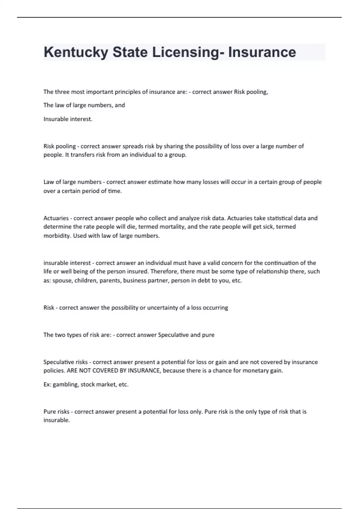 Kentucky State Licensing- InsuranceThe three most important principles of insurance are: - correct answer Risk pooling, The law of large numbers, and Insurable interest. Risk pooling - correct answer spreads risk by sharing the possibility of loss over a large number of people. It transfers risk from an individual to a group. Law of large numbers - correct answer estimate how many losses will occur in a certain group of people over a certain period of time. Actuaries - correct answer people who collect and analyze risk data. Actuaries take statistical data and determine the rate people will die, termed mortality, and the rate people will get sick, termed morbidity. Used with law of large numbers. insurable interest - correct answer an individual must have a valid concern for the continuation of the life or well being of the person insured. Therefore, there must be some type of relationship there, such as: spouse, children, parents, business partner, person in debt to you, etc. Risk - correct answer the possibility or uncertainty of a loss occurring The two types of risk are: - correct answer Speculative and pure Speculative risks - correct answer present a potential for loss or gain and are not covered by insurance policies. ARE NOT COVERED BY INSURANCE, because there is a chance for monetary gain. Ex: gambling, stock market, etc. Pure risks - correct answer present a potential for loss only. Pure risk is the only type of risk that is insurable.