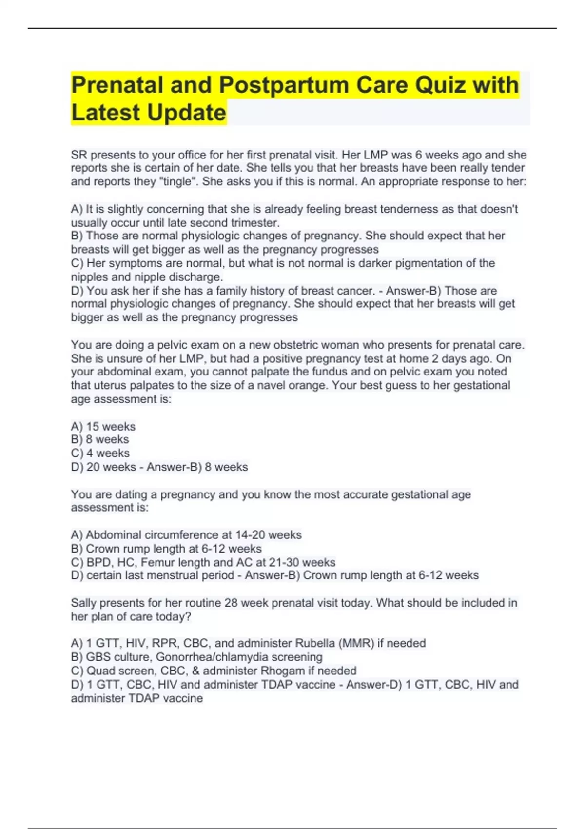 SR presents to your office for her first prenatal visit. Her LMP was 6 weeks ago and she reports she is certain of her date. She tells you that her breasts have been really tender and reports they "tingle". She asks you if this is normal. An appropriate response to her: A) It is slightly concerning that she is already feeling breast tenderness as that doesn't usually occur until late second trimester. B) Those are normal physiologic changes of pregnancy. She should expect that her breasts will get bigger as well as the pregnancy progresses C) Her symptoms are normal, but what is not normal is darker pigmentation of the nipples and nipple discharge. D) You ask her if she has a family history of breast cancer. - Answer-B) Those are normal physiologic changes of pregnancy. She should expect that her breasts will get bigger as well as the pregnancy progresses You are doing a pelvic exam on a new obstetric woman who presents for prenatal care. She is unsure of her LMP, but had a positive pregnancy test at home 2 days ago. On your abdominal exam, you cannot palpate the fundus and on pelvic exam you noted that uterus palpates to the size of a navel orange. Your best guess to her gestational age assessment is: A) 15 weeks B) 8 weeks C) 4 weeks D) 20 weeks - Answer-B) 8 weeks You are dating a pregnancy and you know the most accurate gestational age assessment is: A) Abdominal circumference at 14-20 weeks B) Crown rump length at 6-12 weeks C) BPD, HC, Femur length and AC at 21-30 weeks D) certain last menstrual period - Answer-B) Crown rump length at 6-12 weeks Sally presents for her routine 28 week prenatal visit today. What should be included in her plan of care today? A) 1 GTT, HIV, RPR, CBC, and administer Rubella (MMR) if needed B) GBS culture, Gonorrhea/chlamydia screening C) Quad screen, CBC, & administer Rhogam if needed D) 1 GTT, CBC, HIV and administer TDAP vaccine - Answer-D) 1 GTT, CBC, HIV and administer TDAP vaccine