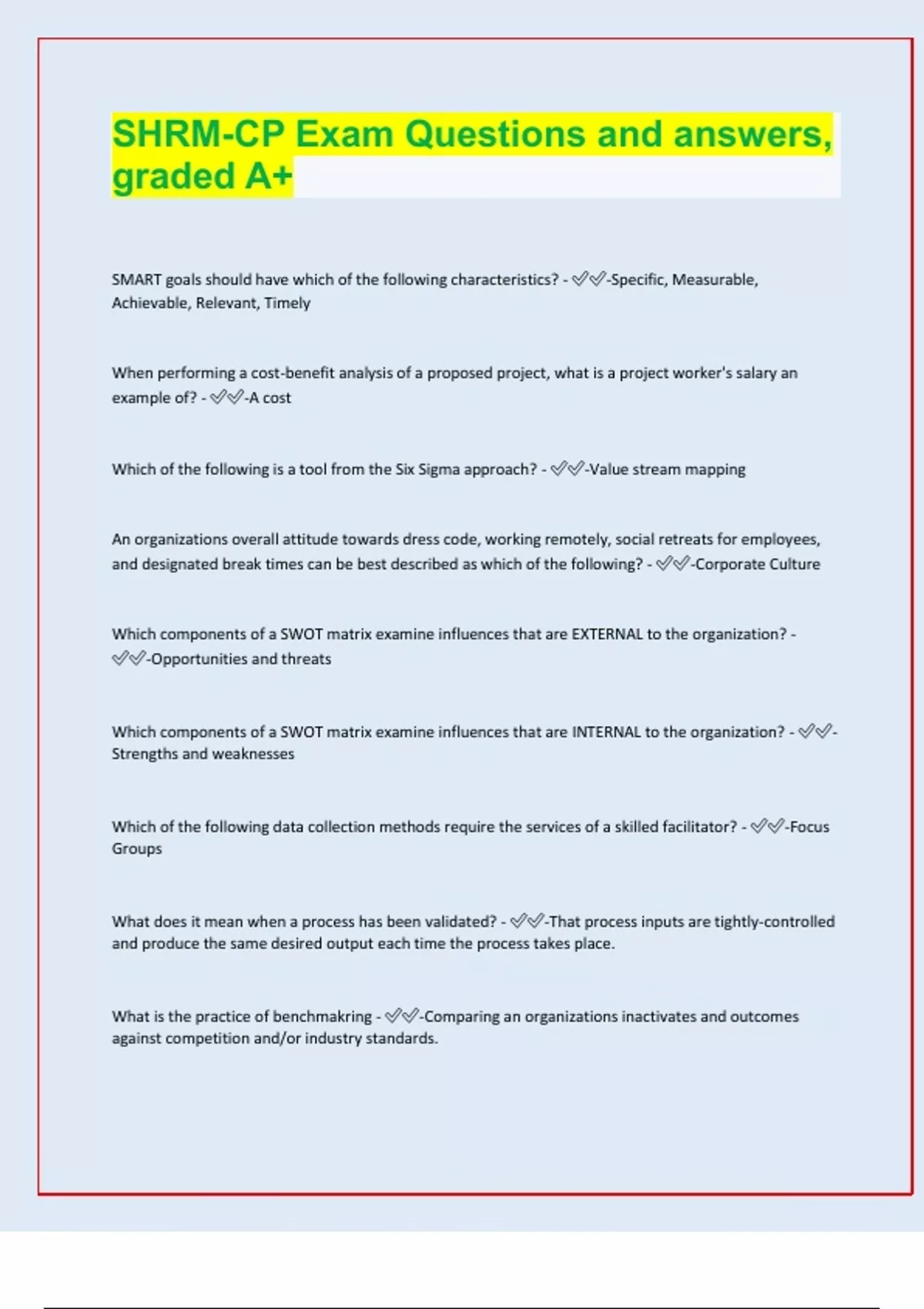 SHRM-CP Exam Questions and answers, graded A+ SMART goals should have which of the following characteristics? - -Specific, Measurable, Achievable, Relevant, Timely When performing a cost-benefit analysis of a proposed project, what is a project worker's salary an example of? - -A cost Which of the following is a tool from the Six Sigma approach? - -Value stream mapping An organizations overall attitude towards dress code, working remotely, social retreats for employees, and designated break times can be best described as which of the following? - -Corporate Culture Which components of a SWOT matrix examine influences that are EXTERNAL to the organization? - -Opportunities and threats Which components of a SWOT matrix examine influences that are INTERNAL to the organization? - - Strengths and weaknesses Which of the following data collection methods require the services of a skilled facilitator? - -Focus Groups What does it mean when a process has been validated? - -That process inputs are tightly-controlled and produce the same desired output each time the process takes place. What is the practice of benchmakring - -Comparing an organizations inactivates and outcomes against competition and/or industry standards. What is confirmation bias? - -The human tendency to seek, favor or influence data to match personal preferences or an established hypothesis. When working with multiple stakeholders who have varied interest, what is the best way to propose and develop a new initiative? - -Select an overlapping interest that could have a feasible solution. Self-awareness, social awareness, relationship management and self-management are components of which of the following? - -Emotional Intelligence What factors does a PESTLE analysis take into consideration? - -Political, economic, social, technological, legal and environmental trends that influence the project. What is the purpose of a root cause analysis? - -To dete