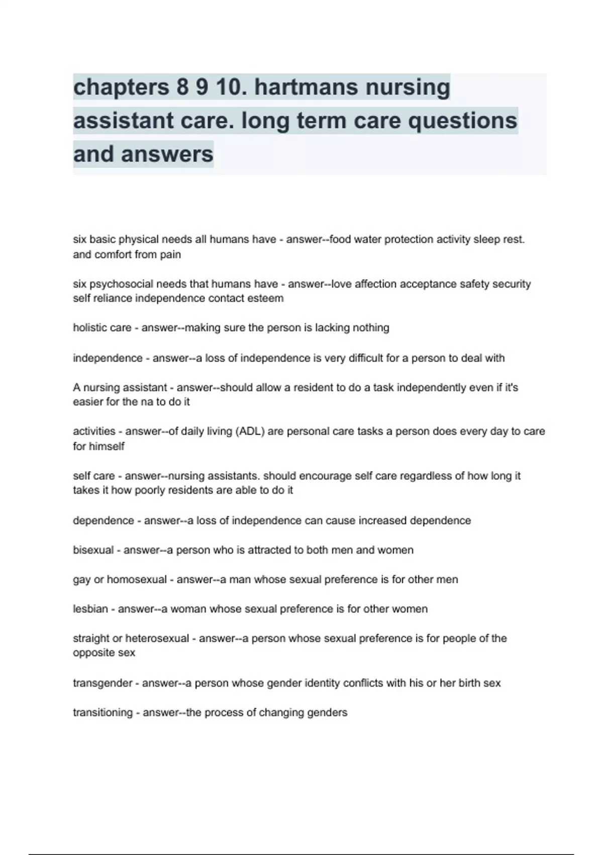 chapters 8 9 10. hartmans nursing assistant care. long term care questions and answers