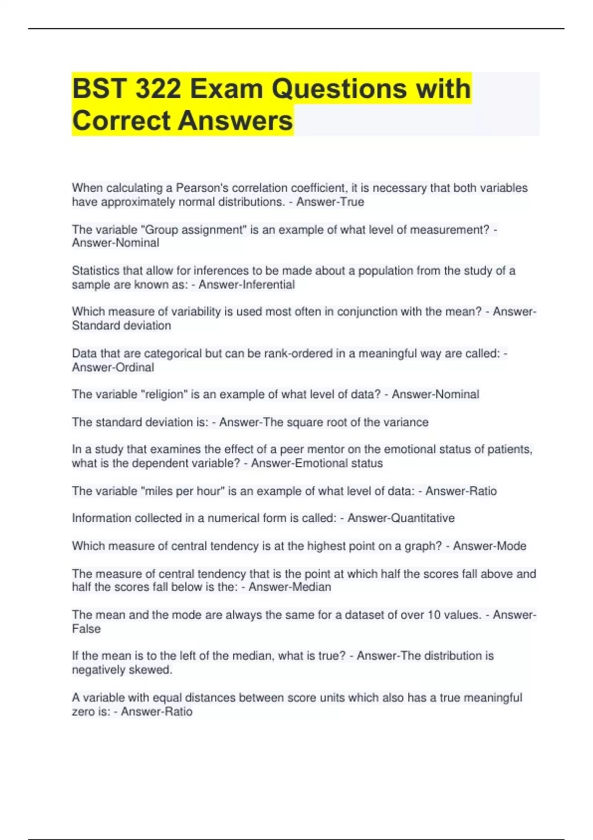 BST 322 Exam Questions with Correct Answers When calculating a Pearson's correlation coefficient, it is necessary that both variables have approximately normal distributions. - Answer-True The variable "Group assignment" is an example of what level of measurement? - Answer-Nominal Statistics that allow for inferences to be made about a population from the study of a sample are known as: - Answer-Inferential Which measure of variability is used most often in conjunction with the mean? - Answer-Standard deviation Data that are categorical but can be rank-ordered in a meaningful way are called: - Answer-Ordinal The variable "religion" is an example of what level of data? - Answer-Nominal The standard deviation is: - Answer-The square root of the variance In a study that examines the effect of a peer mentor on the emotional status of patients, what is the dependent variable? - Answer-Emotional status The variable "miles per hour" is an example of what level of data: - Answer-Ratio Information collected in a numerical form is called: - Answer-Quantitative Which measure of central tendency is at the highest point on a graph? - Answer-Mode The measure of central tendency that is the point at which half the scores fall above and half the scores fall below is the: - Answer-Median