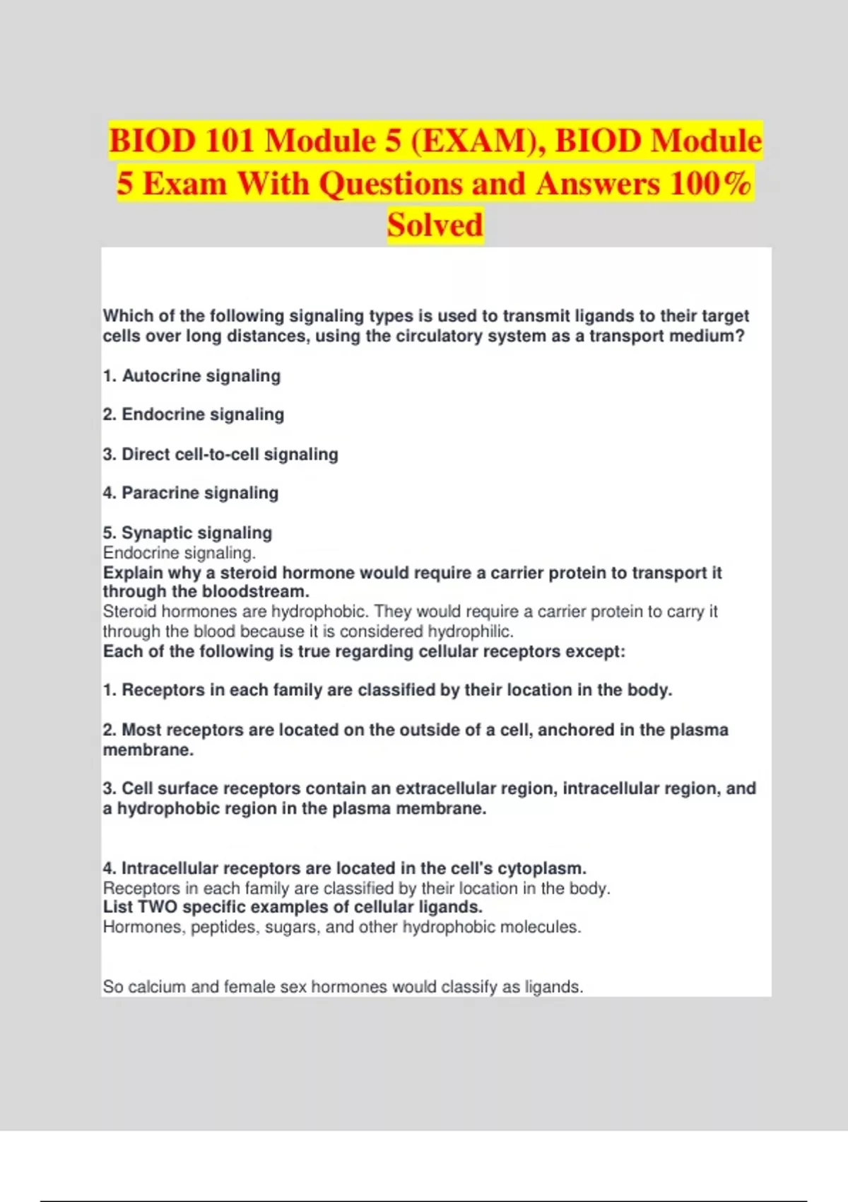 BIOD 101 Module 5 (EXAM), BIOD Module 5 Exam With Questions and Answers 100% Solved Which of the following signaling types is used to transmit ligands to their target cells over long distances, using the circulatory system as a transport medium? 1. Autocrine signaling 2. Endocrine signaling 3. Direct cell-to-cell signaling 4. Paracrine signaling 5. Synaptic signaling Endocrine signaling. Explain why a steroid hormone would require a carrier protein to transport it through the bloodstream. Steroid hormones are hydrophobic. They would require a carrier protein to carry it through the blood because it is considered hydrophilic. Each of the following is true regarding cellular receptors except: 1. Receptors in each family are classified by their location in the body. 2. Most receptors are located on the outside of a cell, anchored in the plasma membrane. 3. Cell surface receptors contain an extracellular region, intracellular region, and a hydrophobic region in the plasma membrane. 4. Intracellular receptors are located in the cell's cytoplasm. Receptors in each family are classified by their location in the body. List TWO specific examples of cellular ligands. Hormones, peptides, sugars, and other hydrophobic molecules. So calcium and female sex hormones would classify as ligands. Fill in the Blank: Transduction is the chain of ___________ and intracellular ___________ that relay signals inside of a cell. 1. Molecules 2. Enzymes Which of the following statements is true of GPCRs? 1. They thread through the plasma membrane forming loops. 2. They are transmembrane hormone receptors. 3. A modified loop receives ligands on their intracellular side. 4. All of the above. They thread through the plasma membrane forming loops. Fill in the Blank: For most biological processes, a typical response would be the release of ___________ of molecules every ___________ that binds. 1. Millions 2. Ligand What role do the ligands involved in endocrine signaling serve in the body. Hormones are the ligands involved in endocrine signaling. They regulate homeostatic mechanisms e.g., blood pressure and energy metabolism. Which of the following best describes calcium's role as a second messenger? 1. It activates protein kinase A. 2. It activates protein kinase C. 3. It binds to proteins to change their shape and function. 4. All of the above. It binds to proteins to change their shape and function. True or False. If false, explain why it is false. A ligand can bind to any cell in the body as long as the receptor is free to bind. False. Ligands have specific receptors they must bind to. If there was no specificity, the ligands would be binding to every single target cell it touches; therefore, resulting in changes throughout the whole body. Which of the following is/are true of RTKs? (Select all that apply). - They are a family of enzyme-linked receptor molecules. - They have an extracellular region only. - They transfer a phosphate group to the amino acid tyrosine on a target protein. -None of the above are true. -They are a family of enzyme-linked receptors m
