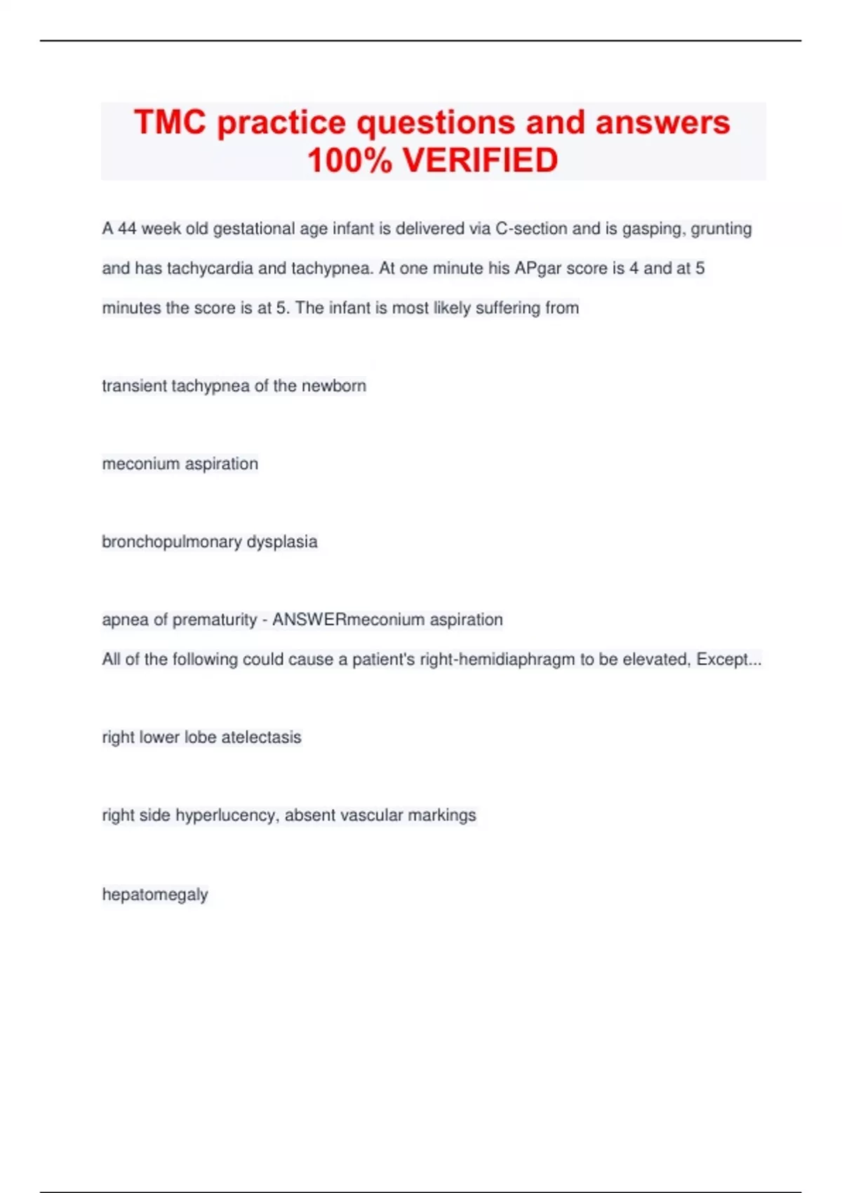 A 44 week old gestational age infant is delivered via C-section and is gasping, grunting and has tachycardia and tachypnea. At one minute his APgar score is 4 and at 5 minutes the score is at 5. The infant is most likely suffering from transient tachypnea of the newborn meconium aspiration bronchopulmonary dysplasia apnea of prematurity - ANSWERmeconium aspiration All of the following could cause a patient's right-hemidiaphragm to be elevated, Except... right lower lobe atelectasis right side hyperlucency, absent vascular markings hepatomegaly right lower lobe consolidation with air bronchograms - ANSWERright side hyperlucency, absent vascular markings A 64 year old, 70 kg (154 lb) man with severe COPD receives independent (differential) lung ventilation following thoracotomy and right lower lobectomy. Which of the following setting combinations would be most appropriate for this patient? Right Lung 50 mL, left lung 459 mL Right lung 159 ml, left lung 359 ml Right lung 250, left lung 250 ml Right lung 350 ml, left lung 150 ml - ANSWERRight lung 150, left lung 350 ml A 2 year old child with croup has been intubated for 4 days with a 4 mm ID uncuffed endotracheal tube. Heated aerosol at an FiO2 of 0.30 has been delivered to the patient. The physician asks the respiratory therapist to evaluate the patient for possible extubation. Which of the following would most likely indicate that the patient is ready for extubation? The patient is making normal quiet ventilatory efforts A negative sputum culture and sensitivity has been reported The patients ABG are within normal range Breath sounds are heard around the tube on auscultation - ANSWERBreath sounds are heard around the tube on auscultation When instructing a patient prior to a vital capacity maneuver, the respiratory therapist should direct the patient to.... exhale to residual volume and inhale to inspiratory capacity inhale to total lung capacity then exhale to residual volume exhale normally then inhale to TLC inhale normally then exhale to FRC - ANSWERinhale to TLC then exhale to RV A patient with end-stage pulmonary fibrosis receieves oxygen at 2 L/min via transtracheal oxygen catheter. The patient complains of increased work of breathing and shortness of breath. The RT should... Manually ventilate the patient with a resusitation bag increase the flow to the transtracheal catheter to 6 lpm evaluate the SpO2 with a pulse oximeter