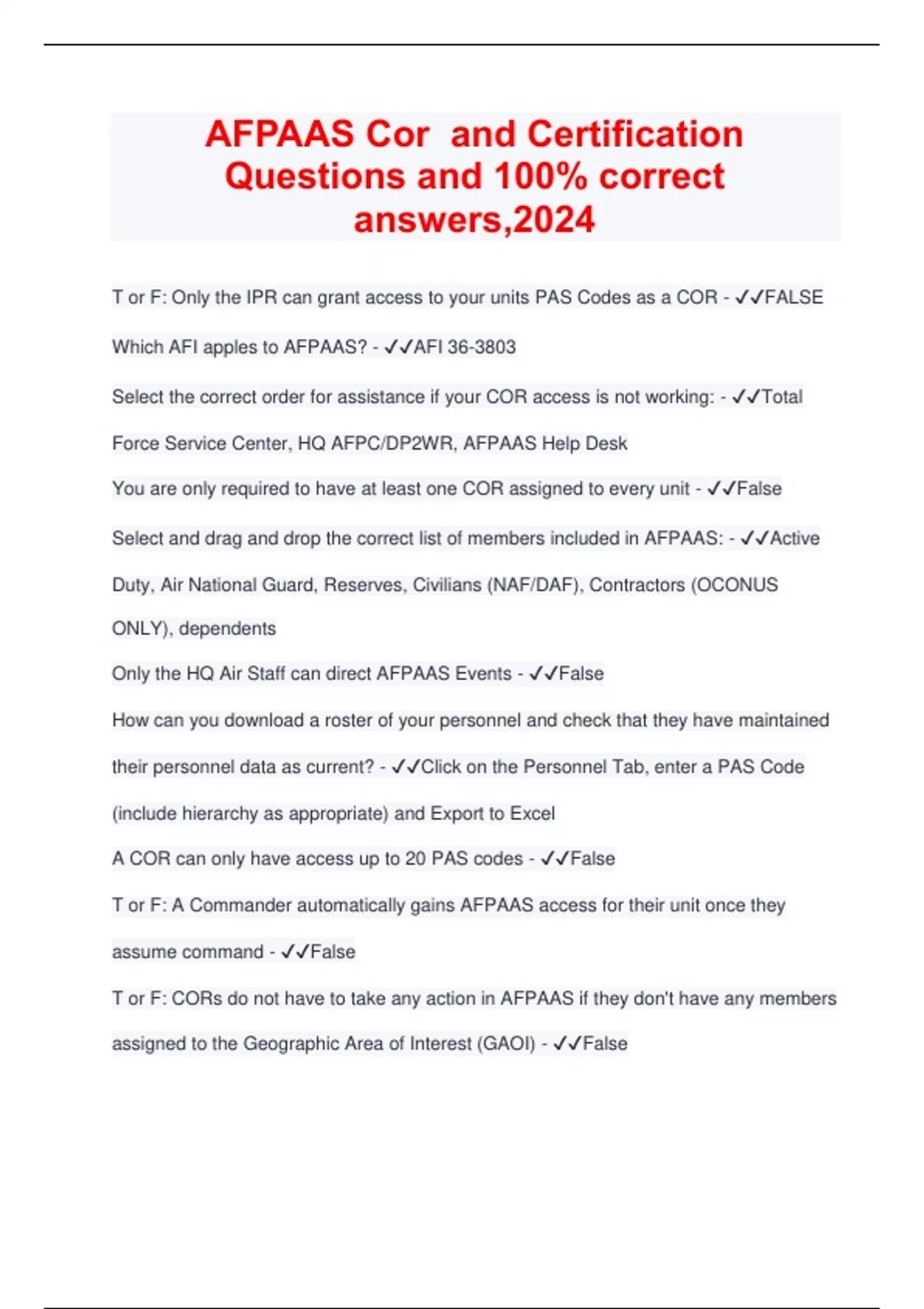 T or F: Only the IPR can grant access to your units PAS Codes as a COR - FALSE Which AFI apples to AFPAAS? - AFI 36-3803 Select the correct order for assistance if your COR access is not working: - Total Force Service Center, HQ AFPC/DP2WR, AFPAAS Help Desk You are only required to have at least one COR assigned to every unit - False Select and drag and drop the correct list of members included in AFPAAS: - Active Duty, Air National Guard, Reserves, Civilians (NAF/DAF), Contractors (OCONUS ONLY), dependent
