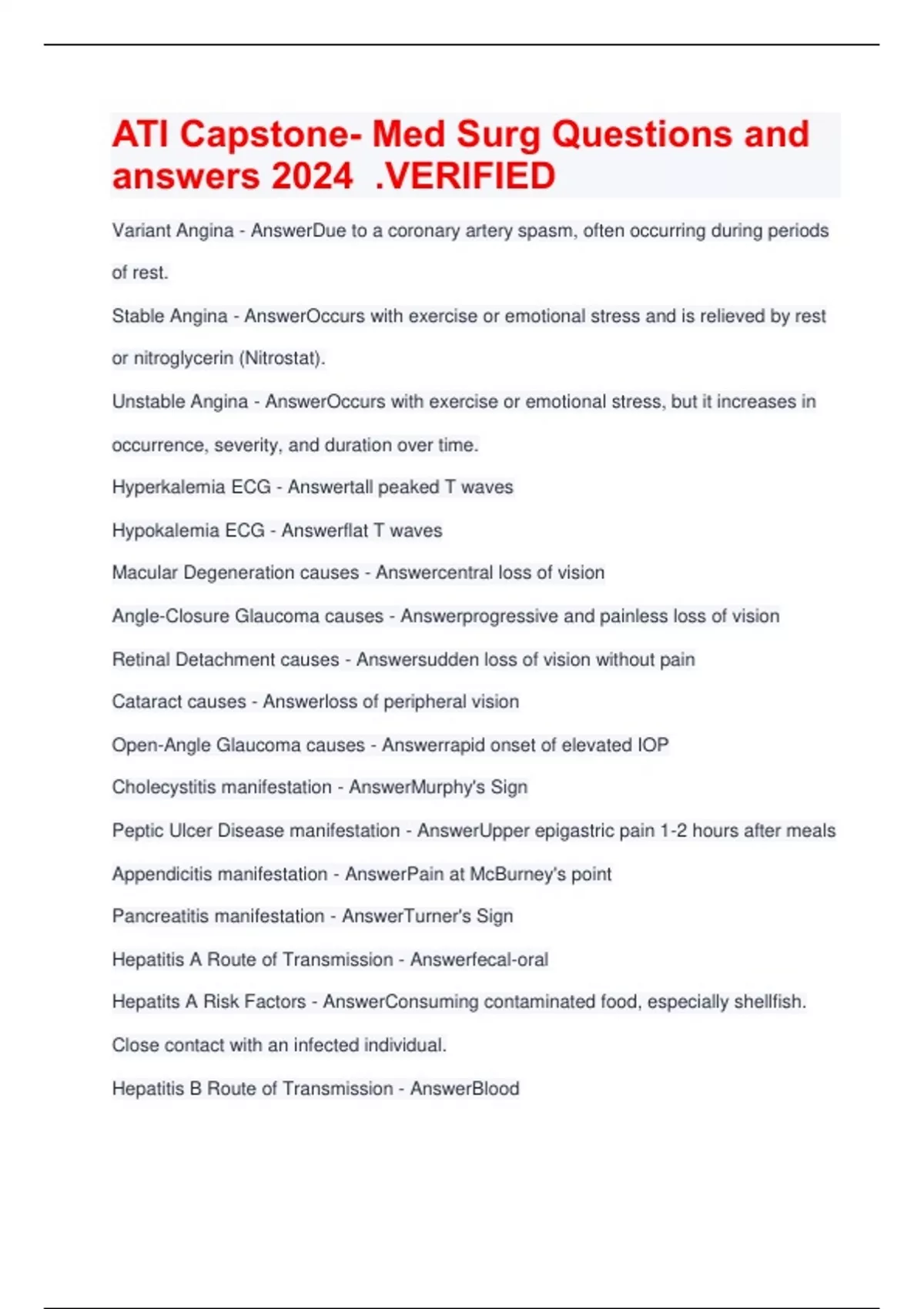 Variant Angina - AnswerDue to a coronary artery spasm, often occurring during periods of rest. Stable Angina - AnswerOccurs with exercise or emotional stress and is relieved by rest or nitroglycerin (Nitrostat). Unstable Angina - AnswerOccurs with exercise or emotional stress, but it increases in occurrence, severity, and duration over time. Hyperkalemia ECG - Answertall peaked T waves Hypokalemia ECG - Answerflat T waves Macular Degeneration causes - Answercentral loss of vision Angle-Closure Glaucoma causes - Answerprogressive and painless loss of vision Retinal Detachment causes - Answersudden loss of vision without pain Cataract causes - Answerloss of peripheral vision Open-Angle Glaucoma causes - Answerrapid onset of elevated IOP Cholecystitis manifestation - AnswerMurphy's Sign Peptic Ulcer Disease manifestation - AnswerUpper epigastric pain 1-2 hours after meals Appendicitis manifestation - AnswerPain at McBurney's point Pancreatitis manifestation - AnswerTurner's Sign Hepatitis A Route of Transmission - Answerfecal-oral Hepatits A Risk Factors - AnswerConsuming contaminated food, especially shellfish. Close contact with an infected individual. Hepatitis B Route of Transmission - AnswerBlood