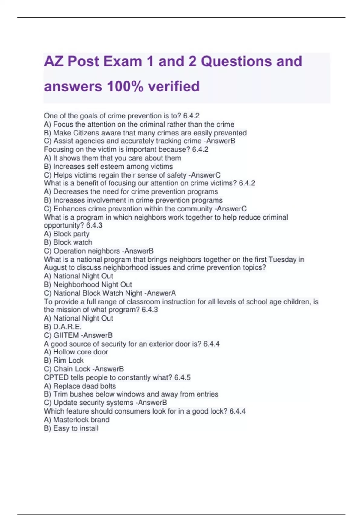 One of the goals of crime prevention is to? 6.4.2 A) Focus the attention on the criminal rather than the crime B) Make Citizens aware that many crimes are easily prevented C) Assist agencies and accurately tracking crime -AnswerB Focusing on the victim is important because? 6.4.2 A) It shows them that you care about them B) Increases self esteem among victims C) Helps victims regain their sense of safety -AnswerC What is a benefit of focusing our attention on crime victims? 6.4.2 A) Decreases the need for crime prevention programs B) Increases involvement in crime prevention programs C) Enhances crime prevention within the community -AnswerC What is a program in which neighbors work together to help reduce criminal opportunity? 6.4.3 A) Block party B) Block watch C) Operation neighbors -AnswerB What is a national program that brings neighbors together on the first Tuesday in August to discuss neighborhood issues and crime prevention topics? A) National Night Out B) Neighborhood Night Out C) National Block Watch Night -AnswerA To provide a full range of classroom instruction for all levels of school age children, is the mission of what program? 6.4.3 A) National Night Out B) D.A.R.E. C) GIITEM -AnswerB A good source of security for an exterior door is? 6.4.4 A) Hollow core door B) Rim Lock C) Chain Lock -AnswerB CPTED tells people to constantly what? 6.4.5 A) Replace dead bolts B) Trim bushes below windows and away from entries C) Update security systems -AnswerB Which feature should consumers look for in a good lock? 6.4.4 A) Masterlock brand B) Easy to install C) 5 pin tumbler -AnswerC Which of the following would NOT be considered a security measure for a residence or business? 6.4.5 A) Outside landscaping B) Operation identification C) Aerial lighting -AnswerB To increase the visibility of a home and make a home easily visible by passer by's you should? 6.4.5 -AnswerTrim bushes 6-7 ft from ground which of the following benefits of focusing attention on crime victims? 6.4.2 - AnswerEnhance crime prevention in a community What is the primary crime prevention function of a LE officer? 6.4.1 -Answerrecognizing crime risks and preparing for those risks When installing dead bolts all are good except? 6.4.4 -Answer3/4 inch srew Focusing on a victim is important because? 6.4.2 -Answer1. Helps a victim retain a sense of safety 2.Reduces the likelihood that the victim will become a repeat victim 3. Enhances crime prevention in the community between what times can a LE officer stop a vehicle with an Arizona automobile theft sticker? -Answer1-5 am you can stop a vehicle Neighborhood watch is _____________ recognized? 6.4.3 -AnswerNationally recognized A program for citizens to join that can reduce crime in their community? 6.4.3 - AnswerBlock watch For proper security at home, consumers should use what type of tumbler? 6.4.4 - Answer5 pin tumbler Residents who are away from home for long periods of time should use what type of lighting 6.4.5 -Answertimers for interior lights Three elements of a crime triangle -Answeropportunity, knowledge, desire Marking property, operation identification -AnswerDrivers license and state Who works on issues regarding truancy and assaults? 6.4.3 -AnswerSchool resource officer What grade level does the G.R.E.A.T program primarily focus on? -AnswerMiddle school children What type of fire extinguisher do police officers carry in their vehicles? A. ABC extinguisher B. BC extinguisher C. C extinguisher -AnswerA. ABC extinguisher What are the four major classes of fires? 3.12.2 -AnswerA-ordinary combustible Bflammable liquids C-electrical D- combustible metals What class of fire burns ordinary combustibles? A. Class A B. Class C C.Class B -AnswerA. Class A Three types of heat transfer? -AnswerConduction Convection Radiation A Class A Fire involves what? A. Ordinary Combustibles B. Flammable liquids C. Combustible metals -AnswerA. Ordinary Combustibles When extinguishing a vehicle engine fire you should be aware of what? A. fluid B. wind direction C. how much of the extinguisher you should use -AnswerB. wind direction When doing crowd control at a fire scene, officers should be aware of what? A. any suspicious person or vehicles B. Fire hoses C. smoke direction -AnswerA. any suspicious person or vehicles What are the principles for conducting a safe and effective search of a burning building? A. use proper personal protective equipment (PPE) B. Work at a deliberate pace C. Stand tall -AnswerB. Work at a deliberate pace What is a strong indicator of a building that is unsafe enter? 3.12.1 A. Door is closed B. Placard explosive material C. Wind direction -AnswerB. Placard explosive material, structure integrity, minor explosions, puffing smoke, rattling windows, toxic or explosive material The most important principle for a safe and effective search of a structure is? 3.12.3 A. Stand up B. Stay close to the floor C. Breathe slowly -AnswerB. Stay close to the floor, leave widows closed, remain calm, work at a deliberate pace, work in pairs Officers that redirect traffic at a fire scene with trucks and equipment in the way - AnswerExtended periods of time How many classes of fires are there? A. 3 B. 5 C. 4 -AnswerC. 4 What odor you should be looking for when investigating and arson? A. Gasoline B. smoke C. cigarettes -AnswerA. Gasoline If an officer is careless when putting out a vehicle's engine fire? 3.12.4 A. It won't matter because they tried B. liable for his or her actions C. officer will be fired -AnswerB. liable for his or her actions The ignition of accumulated soot/gases with the introduction of oxygen is what? A. Free burn B. Backdraft C. Flashover -AnswerB. Backdraft What are class B fires? A. Fires that burn flammable liquid