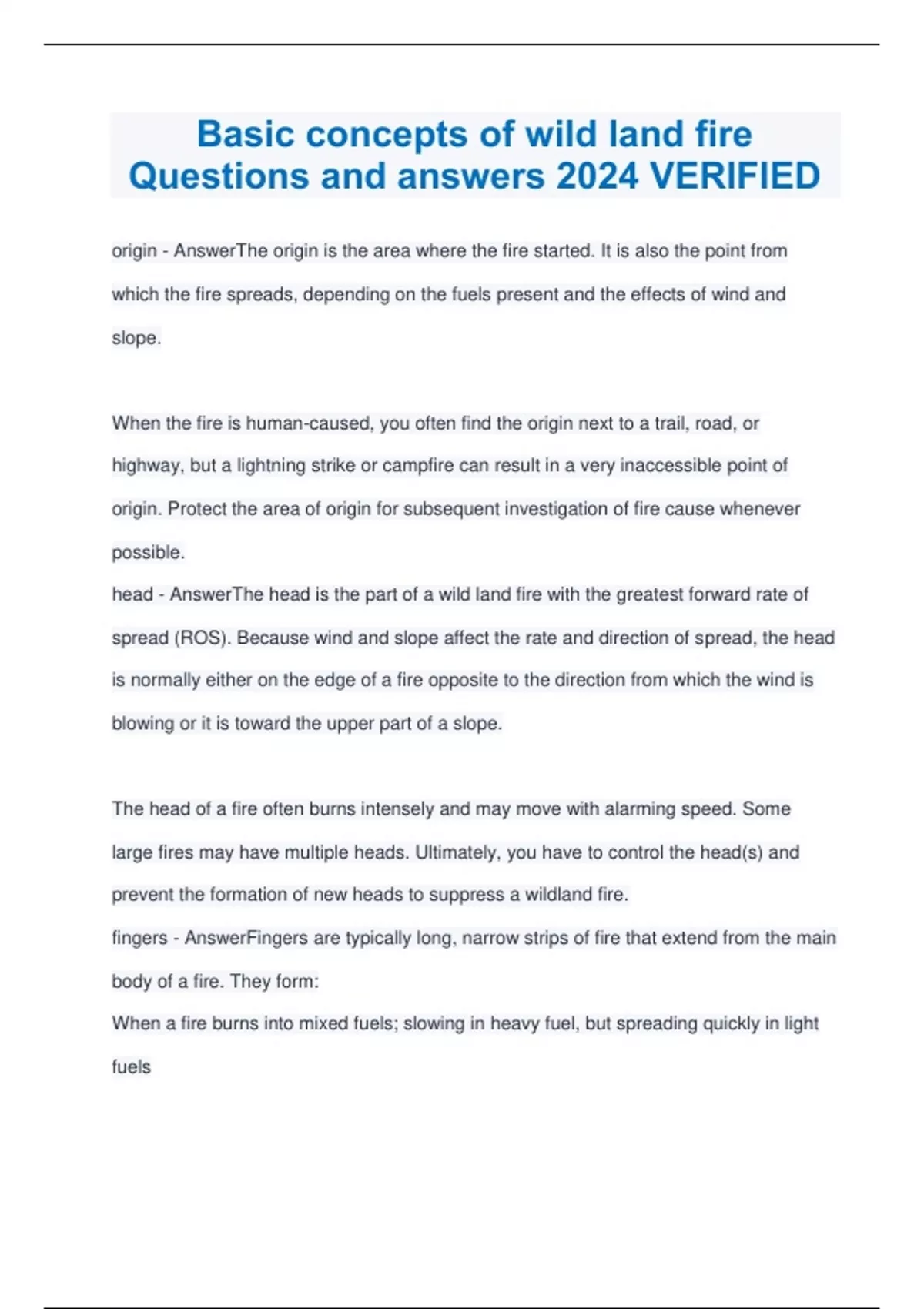 Basic concepts of wild land fire Questions and answers 2024 VERIFIED
