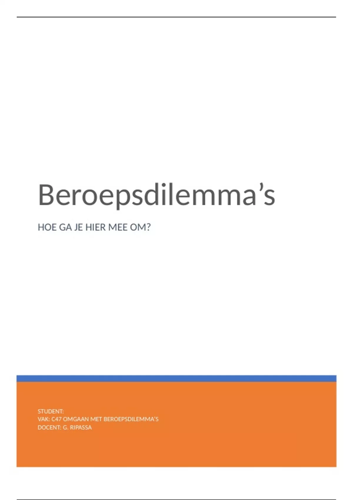 Voor het vak c47 omgaan met beroepsdilemmas voldoet dit beroepsproduct aan de rubrics en APA. Beschreven wordt het ethisch dilemma, ethische stromingen, beroepscode sociaal werker. Behaald met een 9.