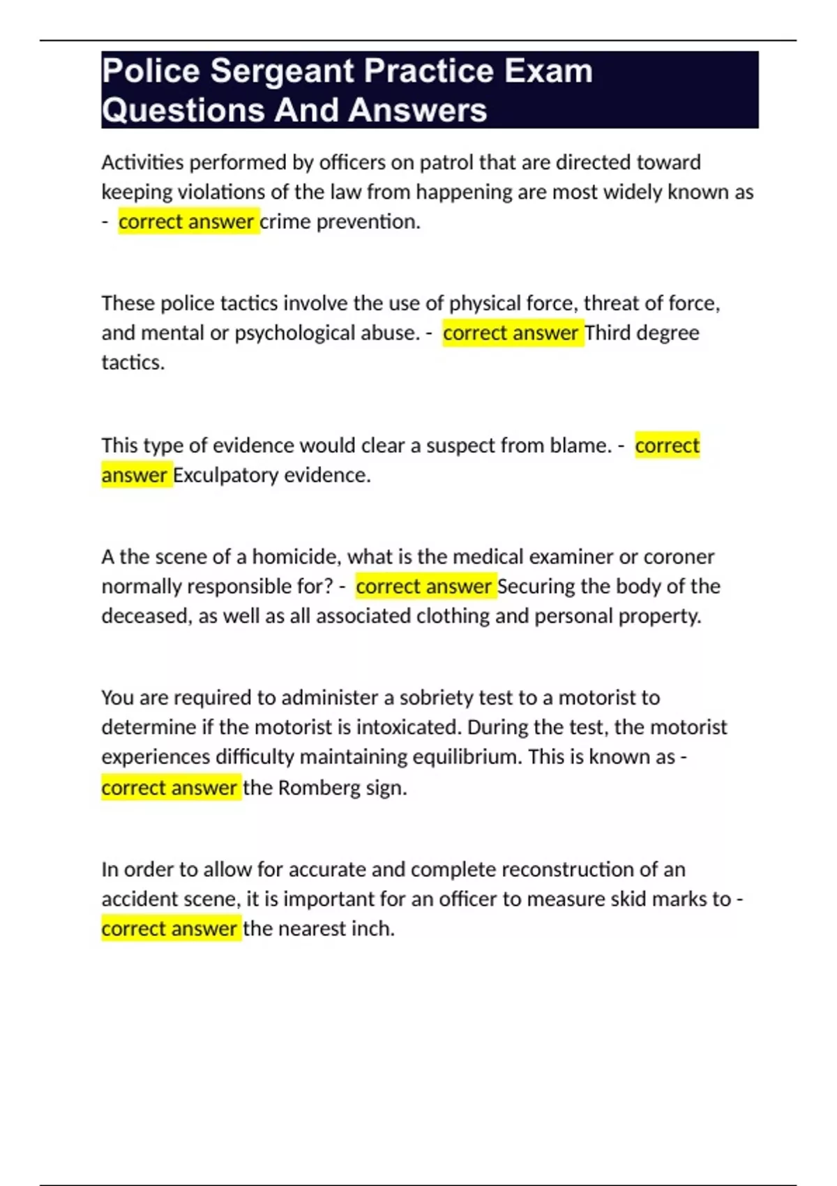 In order to allow for accurate and complete reconstruction of an accident scene, it is important for an officer to measure skid marks to - correct answer the nearest inch. Police Sergeant Practice Exam Questions And Answers Foot patrol by police officers is most effective in combating - correct answer robberies and street muggings.