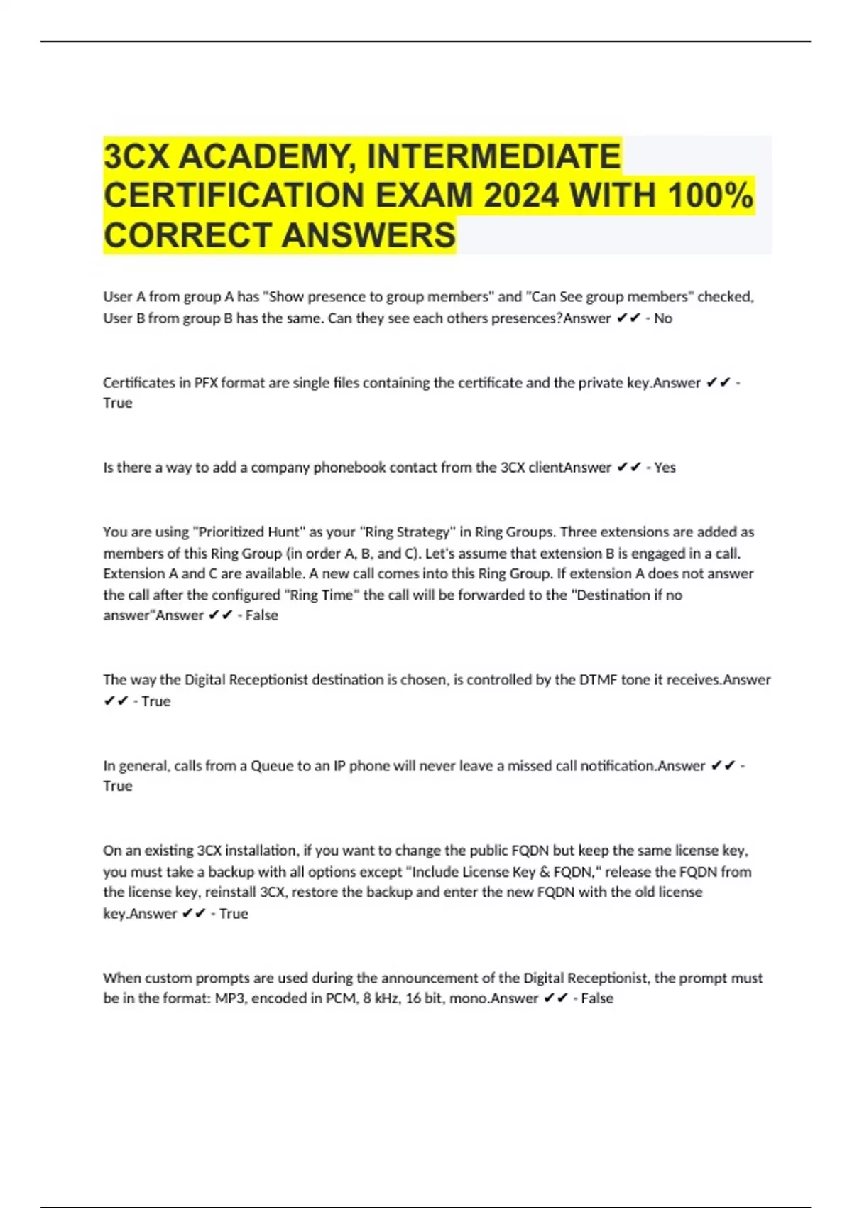User A from group A has "Show presence to group members" and "Can See group members" checked, User B from group B has the same. Can they see each others presences?Answer - No Certificates in PFX format are single files containing the certificate and the private key.Answer - True Is there a way to add a company phonebook contact from the 3CX clientAnswer - Yes You are using "Prioritized Hunt" as your "Ring Strategy" in Ring Groups. Three extensions are added as members of this Ring Group (in order A, B, and C). Let's assume that extension B is engaged in a call. Extension A and C are available. A new call comes into this Ring Group. If extension A does not answer the call after the configured "Ring Time" the call will be forwarded to the "Destination if no answer"Answer - False The way the Digital Receptionist destination is chosen, is controlled by the DTMF tone it receives.Answer - True In general, calls from a Queue to an IP phone will never leave a missed call notification.Answer - True On an existing 3CX installation, if you want to change the public FQDN but keep the same license key, you must take a backup with all options except "Include License Key & FQDN," release the FQDN from the license key, reinstall 3CX, restore the backup and enter the new FQDN with the old license key.Answer - True When custom prompts are used during the announcement of the Digital Receptionist, the prompt must be in the format: MP3, encoded in PCM, 8 kHz, 16 bit, mono.Answer - False
