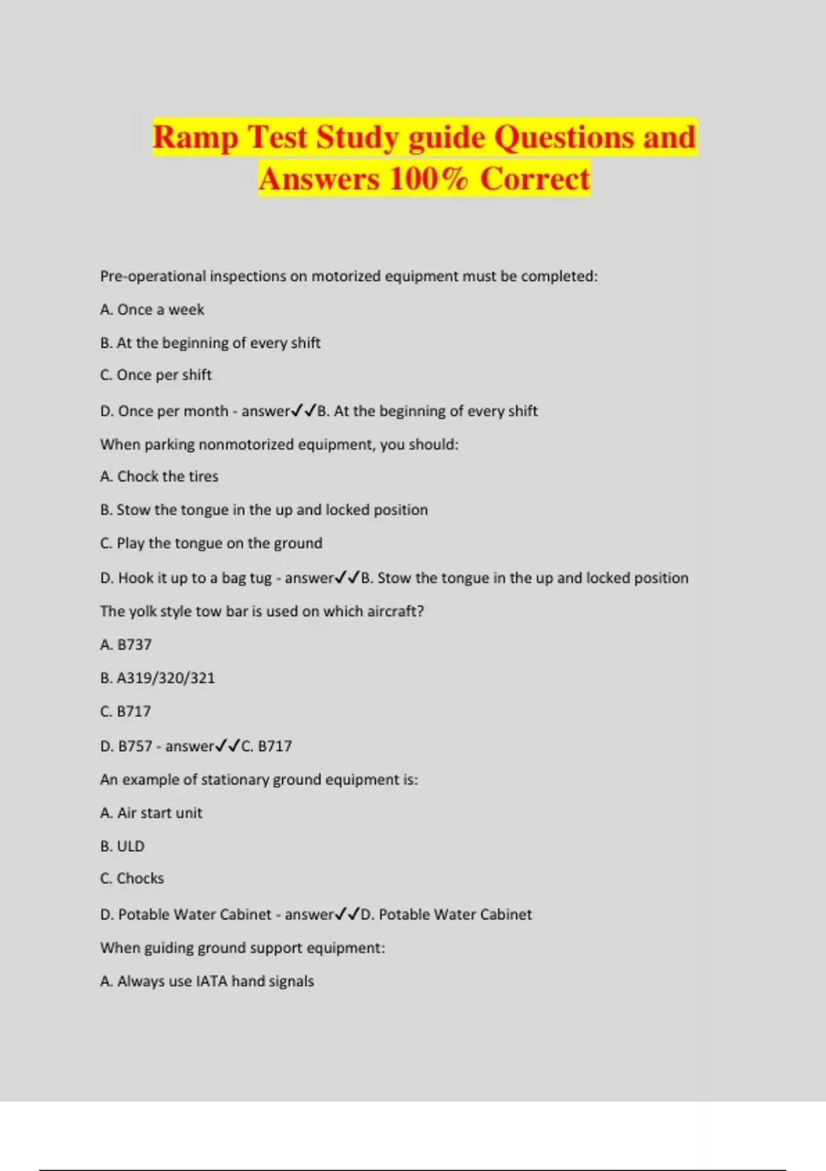 Ramp Test Study guide Questions and Answers 100% Correct Pre-operational inspections on motorized equipment must be completed: A. Once a week B. At the beginning of every shift C. Once per shift D. Once per month - answerB. At the beginning of every shift When parking nonmotorized equipment, you should: A. Chock the tires B. Stow the tongue in the up and locked position C. Play the tongue on the ground D. Hook it up to a bag tug - answerB. Stow the tongue in the up and locked position The yolk style tow bar is used on which aircraft? A. B737 B. A319/320/321 C. B717 D. B757 - answerC. B717 An example of stationary ground equipment is: A. Air start unit B. ULD C. Chocks D. Potable Water Cabinet - answerD. Potable Water Cabinet When guiding ground support equipment: A. Always use IATA hand signals B. Only use a guide person when asked C. Always stay in the line of sight of the driver D. A and C - answerD. A and C What is the maximum number of baggage cards that can be towed behind a bag tug? - answer5 or local policy What is the maximum number of LD-8/LD11 transporters that can be towed behind a tug? - answer3 or local policy Prior to moving conveyances, you should: - answerClose and secure curtains What aircraft has wing mounted engines? A. B757 B. B717 C. B737 D. A and C - answerD. A and C The ________ is the main part of the aircraft. - answerFuselage A _______ is a wide body aircraft. A. B757 B. B767 C. B737 D. B717 - answerB. B767 Chocks must lightly touch the ________ of the tire. - answerCenterline Bin webbing should never be allowe
