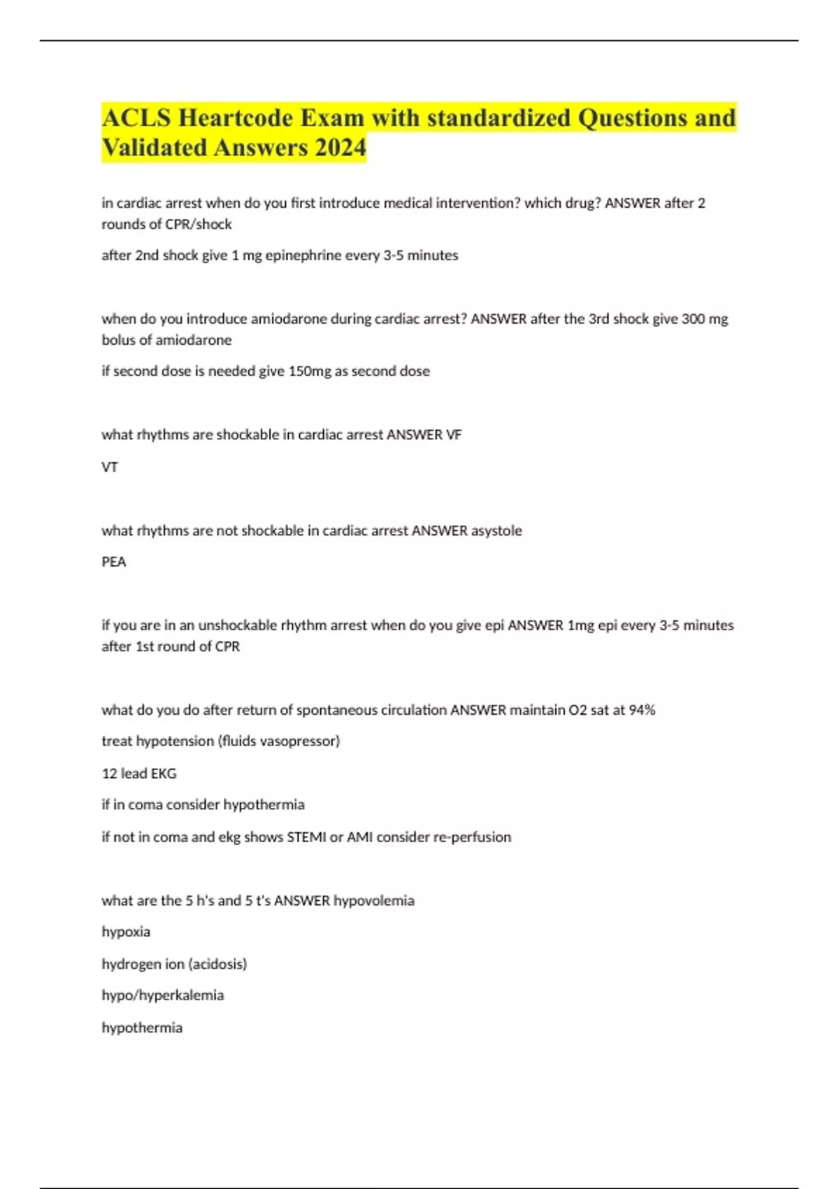 ACLS Heartcode Exam with standardized Questions and Validated Answers 2024 in cardiac arrest when do you first introduce medical intervention? which drug? ANSWER after 2 rounds of CPR/shock after 2nd shock give 1 mg epinephrine every 3-5 minutes when do you introduce amiodarone during cardiac arrest? ANSWER after the 3rd shock give 300 mg bolus of amiodarone if second dose is needed give 150mg as second dose what rhythms are shockable in cardiac arrest ANSWER VF VT what rhythms are not shockable in cardiac arrest ANSWER asystole PEA if you are in an unshockable rhythm arrest when do you give epi ANSWER 1mg epi every 3-5 minutes after 1st round of CPR what do you do after return of spontaneous circulation ANSWER maintain O2 sat at 94% treat hypotension (fluids vasopressor) 12 lead EKG if in coma consider hypothermia if not in coma and ekg shows STEMI or AMI consider re-perfusion what are the 5 h's and 5 t's ANSWER hypovolemia hypoxia hydrogen ion (acidosis) hypo/hyperkalemia hypothermia