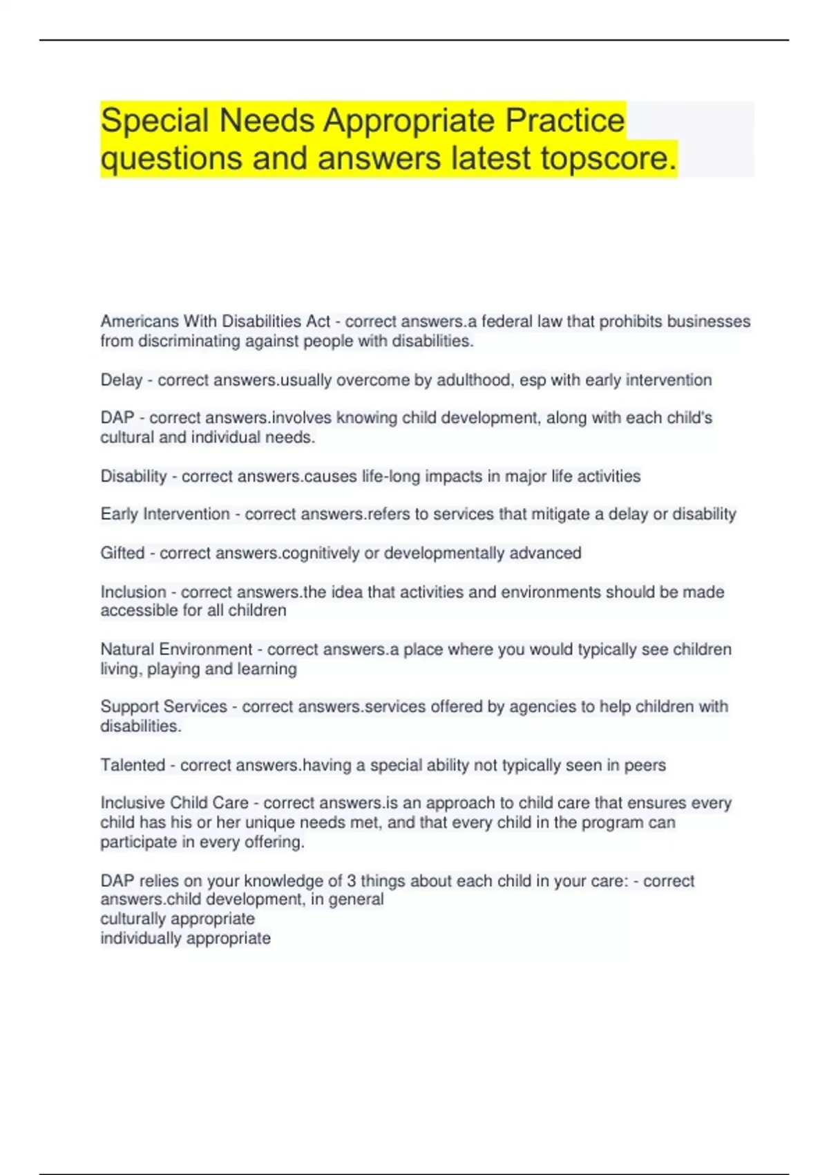 Special Needs Appropriate Practice questions and answers latest topscore. Americans With Disabilities Act - correct answers.a federal law that prohibits businesses from discriminating against people with disabilities. Delay - correct ly overcome by adulthood, esp with early intervention DAP - correct ves knowing child development, along with each child's cultural and individual needs. Disability - correct s life-long impacts in major life activities Early Intervention - correct s to services that mitigate a delay or disability Gifted - correct tively or developmentally advanced Inclusion - correct idea that activities and environments should be made accessible for all children Natural Environment - correct answers.a place where you would typically see children living, playing and learning Support Services - correct ces offered by agencies to help children with disabilities. Talented - correct g a special ability not typically seen in peers Inclusive Child Care - correct an approach to child care that ensures every child has his or her unique needs met, and that every child in the program can participate in every offering. DAP relies on your knowledge of 3 things about each child in your care: - correct development, in general culturally appropriate individually appropriate Examples of Support Services: - correct ning, assessment, and evaluation of suspected disability medical services, devices and therapies advocacy and support professional groups. People First Langauge - correct a way to structure speech so it is supportive of children with special needs. two steps: recognize the person first and then the condition and then avoid prejudicial langauge about children with special needs. handicapped children - correct ility/special needs crippled children - correct cal disability deaf children - correct ng loss/impairment cp victim - correct al palsy confined to a wheelchair - correct a wheelchair suffers from.... - correct suggers/has Role Of Empathy and Sympathy - correct g sympathy or empathy for the children in your care, and for their families, is a key part of providing quality inclusive child care and will help you remember to use people first language Empowering Children - correct them cope with the stereotypical attitudes and behaviors of other people. T/F child care centers that do not accept vouchers or other subsides are specifically excused from the requirements of the ADA, although they may comply voluntarily. - correct answers.True T/F child care centers run by churches, mosques, or synagogues are subjected to the provisions of the ADA because they are public accommodations - correct answers.False T/F privately-owned businesses (including many child care centers) occupying facilities constructed before the ADA was passed in 1990 enjoy a "grandfather" clause that exempts from them making accessibility modifications - correct answers.True Respite Care - correct supervision for a child with a disibility that provides the childs usual caregiver. (normally, a parent or guardian) a necessary break from daily care.