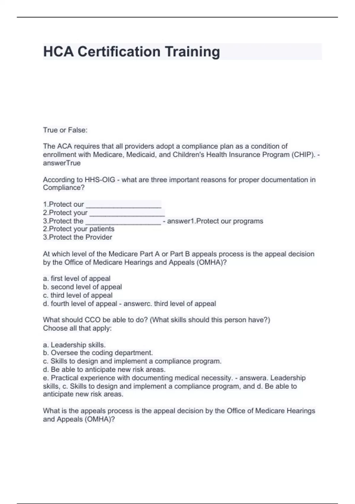 HCA Certification Training Questions and Answers Fully solved
