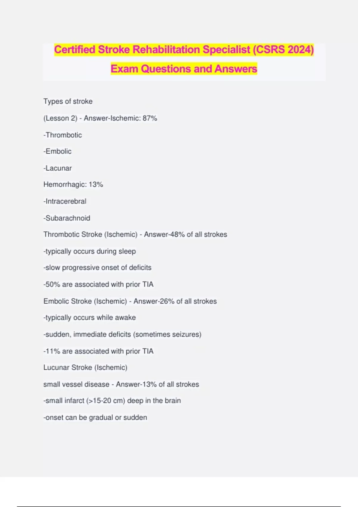 Certified Stroke Rehabilitation Specialist (CSRS 2024) Exam Questions and Answers Types of stroke (Lesson 2) - Answer-Ischemic: 87% -Thrombotic -Embolic -Lacunar Hemorrhagic: 13% -Intracerebral -Subarachnoid Thrombotic Stroke (Ischemic) - Answer-48% of all strokes -typically occurs during sleep -slow progressive onset of deficits -50% are associated with prior TIA Embolic Stroke (Ischemic) - Answer-26% of all strokes -typically occurs while awake -sudden, immediate deficits (sometimes seizures) -11% are associated with prior TIA Lucunar Stroke (Ischemic) small vessel disease - Answer-13% of all strokes -small infarct (>15-20 cm) deep in the brain -onset can be gradual or sudden -23% associated with proceeding TIA -often pure sensory or motor symptoms -typically no higher cortical functional involved Intracerebral Hemmorhage (ICH) - Answer-10% of all strokes -90% happen with the patient is under "no stress" -major cause of "hypertension" -onset may be gradual or sudden -8% are associated with prior TIA -direct correlation with high blood pressure/ hypertension Subarachnoid Hemorrhage (SAH) - Answer-3% of all stroke -occurs often during strenuous activity -cause: rupture aneurysms and vascular malformations -sudden onset -7% are associated with preceding TIA Left Stroke with Right Hemiplegia - Answer--Language/Perceptual problems -expressive aphasia -receptive aphasia -global aphasia -alexia, agraphia , acalculia -apraxias: motor planning perceptual problems (Impaired verbal and math skills with word letter discrimination Left Stroke with Right Hemiplegia (BEHAVIORS) - Answer--Slow, anxious, cautious, normal attention span -underestimated abilities -emotionally labile ( abrupt mood changes) -quick to anger and/or become frustrated Right Stroke with Left Hemiplegia - Answer-Perceptual problems/ Distortion of physical reality -visual spatial disorders :depth perception -constructional relationships -directional concepts -neglect, drawing abilities -body schema perception disorders; -perceptual language disorders language Right Stroke with Left Hemiplegia (BEHAVIORS) - Answer--fast and impulsive -short attention span -overestimate abilities/ judgement -denial of illness (anosognosia) -lack of inhibition -inability to express emotions /affect is flat Cerebrum - Answer--frontal, parietal, temporal, and occipital lobes -consisting of two hemispheres, left and right, separated by a fissure -responsible for the integration of complex sensory and neural functions and the initiation and coordination of voluntary activity in the body. initiates and coordinates movement and regulates temperature. Other areas of the cerebrum enable speech, judgment, thinking and reasoning, problem-solving, emotions and learning. Frontal Lobe - Answer--controls voluntary movement -thinking problem solving -reasoning judgement -personality Primary Motor Cortex (motor homunculus) - Answer--located on the pre-central gyrus -controls voluntary movement -lesion to this area results in