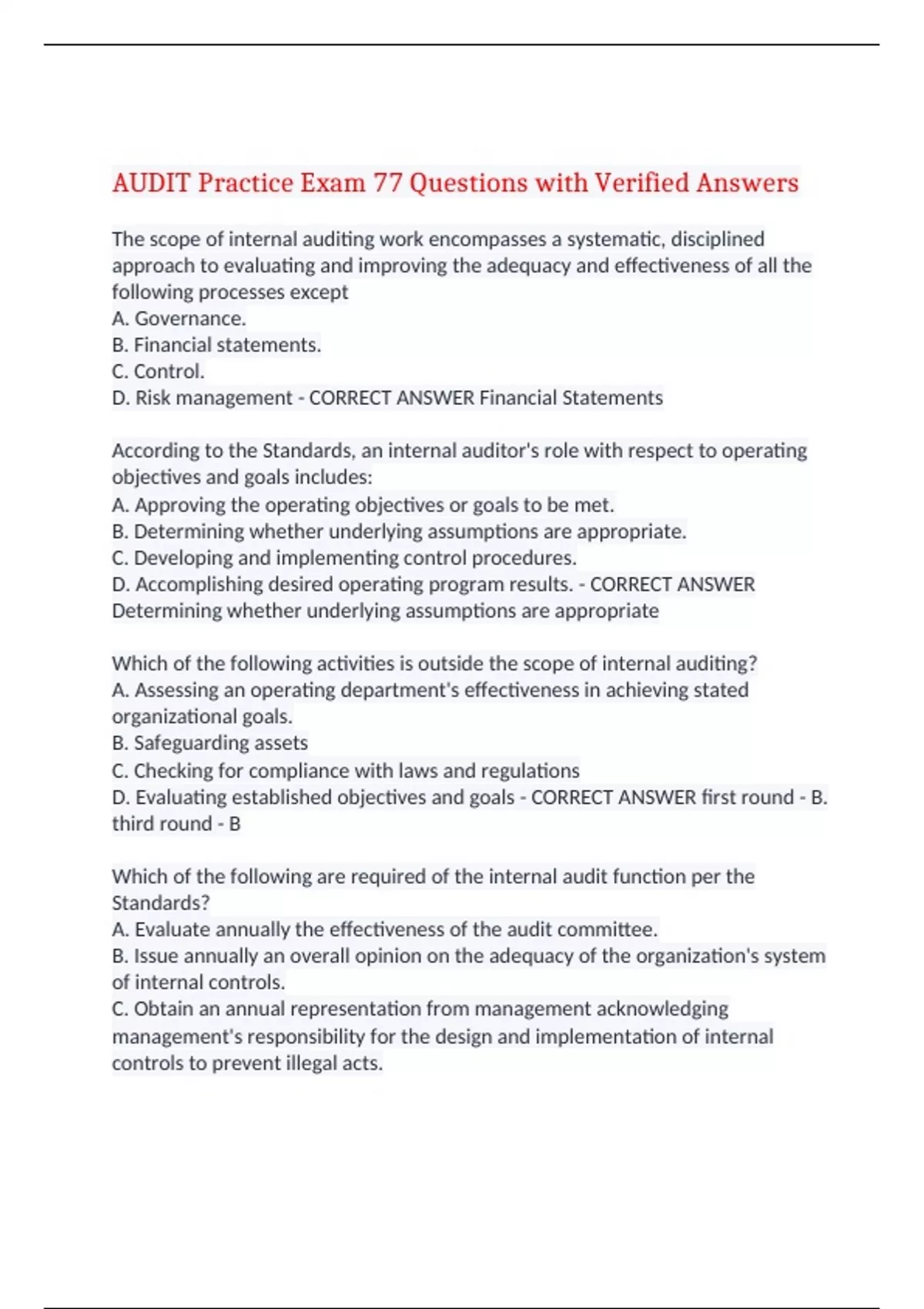 AUDIT Practice Exam 77 Questions with Verified Answers The scope of internal auditing work encompasses a systematic, disciplined approach to evaluating and improving the adequacy and effectiveness of all the following processes except A. Governance. B. Financial statements. C. Control. D. Risk management - CORRECT ANSWER Financial Statements According to the Standards, an internal auditor's role with respect to operating objectives and goals includes: A. Approving the operating objectives or goals to be met. B. Determining whether underlying assumptions are appropriate. C. Developing and implementing control procedures. D. Accomplishing desired operating program results. - CORRECT ANSWER Determining whether underlying assumptions are appropriate Which of the following activities is outside the scope of internal auditing? A. Assessing an operating department's effectiveness in achieving stated organizational goals. B. Safeguarding assets C. Checking for compliance with laws and regulations D. Evaluating established objectives and goals - CORRECT ANSWER first round - B. third round - B Which of the following are required of the internal audit function per the Standards? A. Evaluate annually the effectiveness of the audit committee. B. Issue annually an overall opinion on the adequacy of the organization's system of internal controls. C. Obtain an annual representation from management acknowledging management's responsibility for the design and implementation of internal controls to prevent illegal acts. D. Assess whether the information technology governance of the organization sustains and supports the organization's strategies and objectives. - CORRECT ANSWER CORRECT C. Obtain an annual representation from management acknowledging management's responsibility for the design and implementation of internal controls to prevent illegal acts. Ref. Standard 1320 - Reporting on the Quality Assurance and Improvement Program "The chief audit executive must communicate the results of the quality assurance and improvement program to senior management and the board." When assessing risk management processes, internal auditors consider researching and reviewing current developments, trends, and other appropriate sources of information to determine I. Risks that may affect the organization II. Exposures that may affect the organization III. Related control procedures to use A.I and II only B. II and III only C. III only D. I, II, and III - CORRECT ANSWER I, II, and III The proper organizational role of internal auditing is to A. Perform studies to assist in the attainment of more efficient operations. B. Serve as the investigative arm of the board. C. Assist the external auditor in order to reduce external audit fees. D. Serve as an independent, objective assurance and consulting activity that adds value to operations. - CORRECT ANSWER Serve as an independent, objective assurance and consulting activity that adds value to operations. Requiring two signatures on all checks written for more than $10,000 is an example of a: A. Preventive control. B. Monitoring control C. Detective control. D. Corrective control. - CORRECT ANSWER A. Preventative control All of the following are primary objectives of the overall management process except: A. Improving the effectiveness of governance, risk management, and control processes. B. Compliance with laws, regulations, ethical and business norms, and contracts. C. Identification of risk exposures and use of effective strategies to control them. D. Safeguarding of the organization's assets. - CORRECT ANSWER Improving the effectiveness of governance, risk management, and control processes. (This is a function of Internal Audit) The policies and procedures helping to ensure that management directives are executed and actions are taken to address risks to achievement of objectives describes A. Risk assessments B. Control environments C. Control activities D. Monitoring - CORRECT ANSWER Control activities Flowcharting would most likely be used in the evaluation of controls in: A. An application involving the joint efforts of both internal and external auditing. B. An internal audit department with limited experience in the evaluation of internal control systems. C. A simple but well documented system. D. A complex system - CORRECT ANSWER A simple but well documented system?? Who is ultimately responsible for identifying new or emerging key risk areas that should be covered by the organization's governance process? A. The board of directors B. Senior management C. Risk owners D. The internal audit function. - CORRECT ANSWER Senior Management Directors, management, external auditors, and internal auditors all play important roles in creating proper control processes. Senior management is primarily responsible for A. Establishing and maintaining an organizational culture. B. Reviewing the reliability and integrity of financial and operational information. C. Ensuring that external and internal auditors oversee the administration of the system of risk management and control processes. D. Implementing and monitoring controls designed by the board of directors. - CORRECT ANSWER Establishing and Maintaining organizational culture Which of the following describes a control weakness? A. Purchasing procedures are well designed and are followed unless otherwise directed by the purchasing supervisor. B. Pre-numbered blank purchase orders are secured within the purchasing department C. Normal operational purchases fall in the range from $500 to $1,000 with two signatures required for purchases over $1,000 D. The purchasing agent invests in a publicly traded mutual fund that lists the stock of one of the organization's suppliers in its portfolio. - CORRECT ANSWER Purchasing Procedures are well designed and are followed unless otherwise directed by the purchasing supervisor In the risk management process, management's view of the internal audit activity's role is likely to be determine