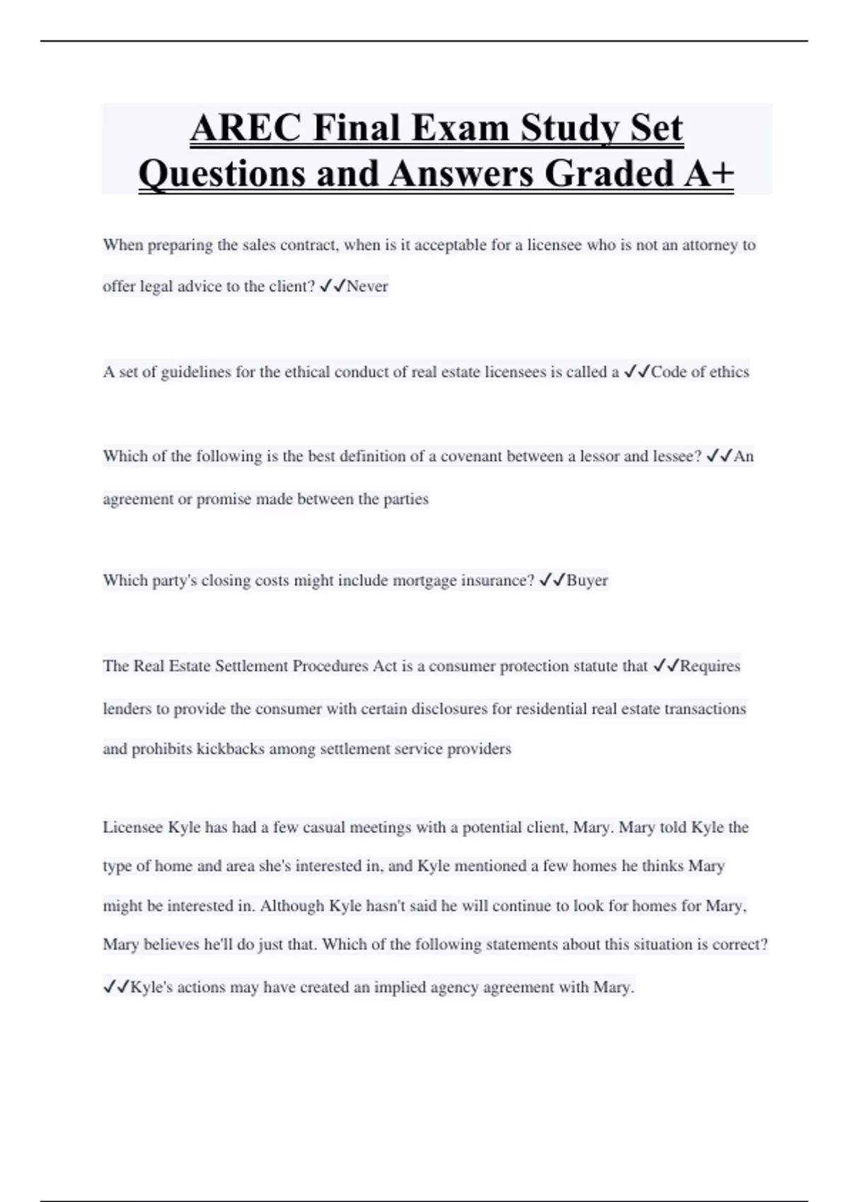 AREC Final Exam Study Set Questions and Answers Graded A+ When preparing the sales contract, when is it acceptable for a licensee who is not an attorney to offer legal advice to the client? Never A set of guidelines for the ethical conduct of real estate licensees is called a Code of ethics Which of the following is the best definition of a covenant between a lessor and lessee? An agreement or promise made between the parties Which party's closing costs might include mortgage insurance? Buyer The Real Estate Settlement Procedures Act is a consumer protection statute that Requires lenders to provide the consumer with certain disclosures for residential real estate transactions and prohibits kickbacks among settlement service providers Licensee Kyle has had a few casual meetings with a potential client, Mary. Mary told Kyle the type of home and area she's interested in, and Kyle mentioned a few homes he thinks Mary might be interested in. Although Kyle hasn't said he will continue to look for homes for Mary, Mary believes he'll do just that. Which of the following statements about this situation is correct? Kyle's actions may have created an implied agency agreement with Mary.