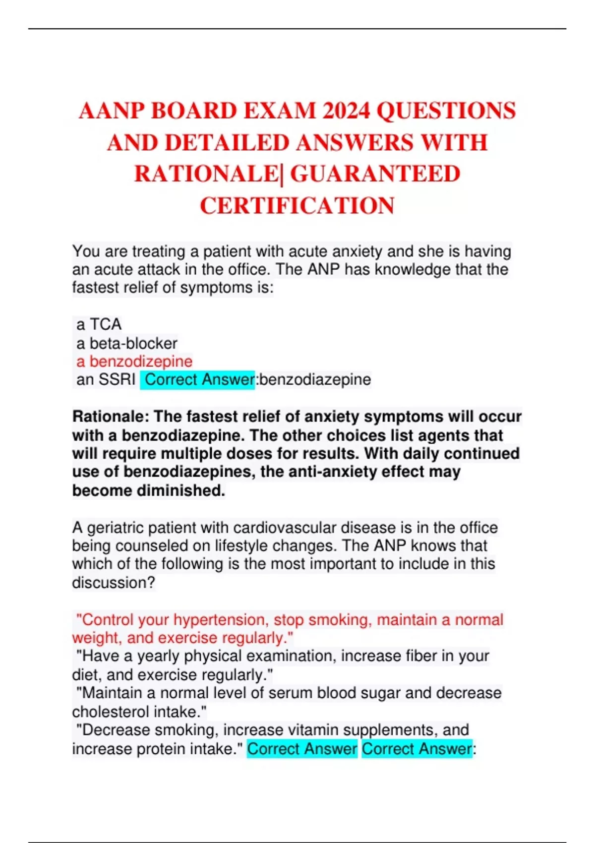 AANP BOARD EXAM 2024 QUESTIONS AND DETAILED ANSWERS WITH RATIONALE| GUARANTEED CERTIFICATION You are treating a patient with acute anxiety and she is having an acute attack in the office. The ANP has knowledge that the fastest relief of symptoms is: a TCA a beta-blocker a benzodizepine an SSRI Correct Answer:benzodiazepine Rationale: The fastest relief of anxiety symptoms will occur with a benzodiazepine. The other choices list agents that will require multiple doses for results. With daily continued use of benzodiazepines, the anti-anxiety effect may become diminished. A geriatric patient with cardiovascular disease is in the office being counseled on lifestyle changes. The ANP knows that which of the following is the most important to include in this discussion?