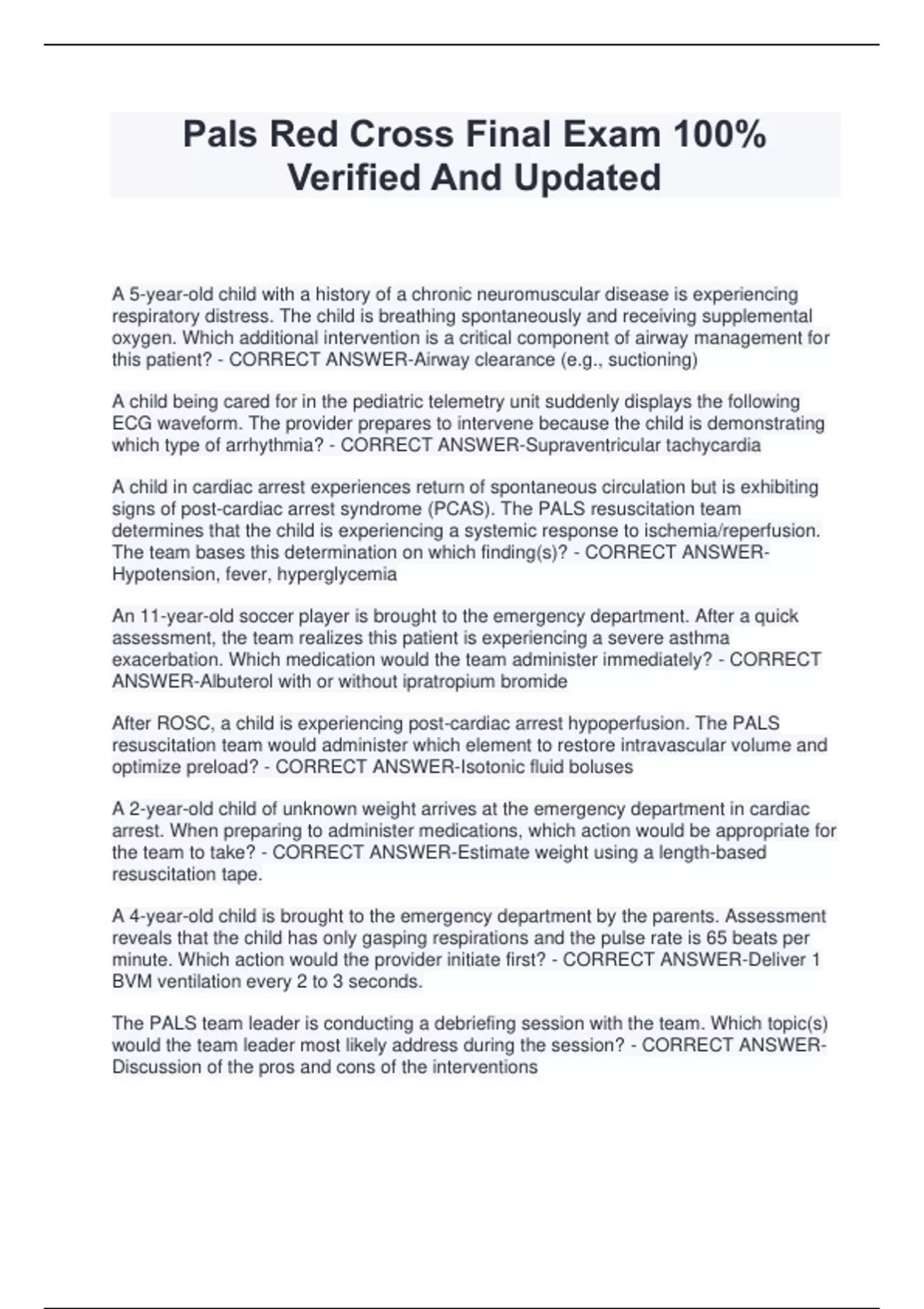 Pals Red Cross Final Exam 100% Verified And Updated A 5-year-old child with a history of a chronic neuromuscular disease is experiencing respiratory distress. The child is breathing spontaneously and receiving supplemental oxygen. Which additional intervention is a critical component of airway management for this patient? - CORRECT ANSWER-Airway clearance (e.g., suctioning) A child being cared for in the pediatric telemetry unit suddenly displays the following ECG waveform. The provider prepares to intervene because the child is demonstrating which type of arrhythmia? - CORRECT ANSWER-Supraventricular tachycardia A child in cardiac arrest experiences return of spontaneous circulation but is exhibiting signs of post-cardiac arrest syndrome (PCAS). The PALS resuscitation team determines that the child is experiencing a systemic response to ischemia/reperfusion. The team bases this determination on which finding(s)? - CORRECT ANSWERHypotension, fever, hyperglycemia An 11-year-old soccer player is brought to the emergency department. After a quick assessment, the team realizes this patient is experiencing a severe asthma exacerbation. Which medication would the team administer immediately? - CORRECT ANSWER-Albuterol with or without ipratropium bromide After ROSC, a child is experiencing post-cardiac arrest hypoperfusion. The PALS resuscitation team would administer which element to restore intravascular volume and optimize preload? - CORRECT ANSWER-Isotonic fluid boluses A 2-year-old child of unknown weight arrives at the emergency department in cardiac arrest. When preparing to administer medications, which action would be appropriate for the team to take? - CORRECT ANSWER-Estimate weight using a length-based resuscitation tape. A 4-year-old child is brought to the emergency department by the parents. Assessment reveals that the child has only gasping respirations and the pulse rate is 65 beats per minute. Which action would the provider initiate first? - CORRECT ANSWER-Deliver 1 BVM ventilation every 2 to 3 seconds. The PALS team leader is conducting a debriefing session with the team. Which topic(s) would the team leader most likely address during the session? - CORRECT ANSWERDiscussion of the pros and cons of the interventions