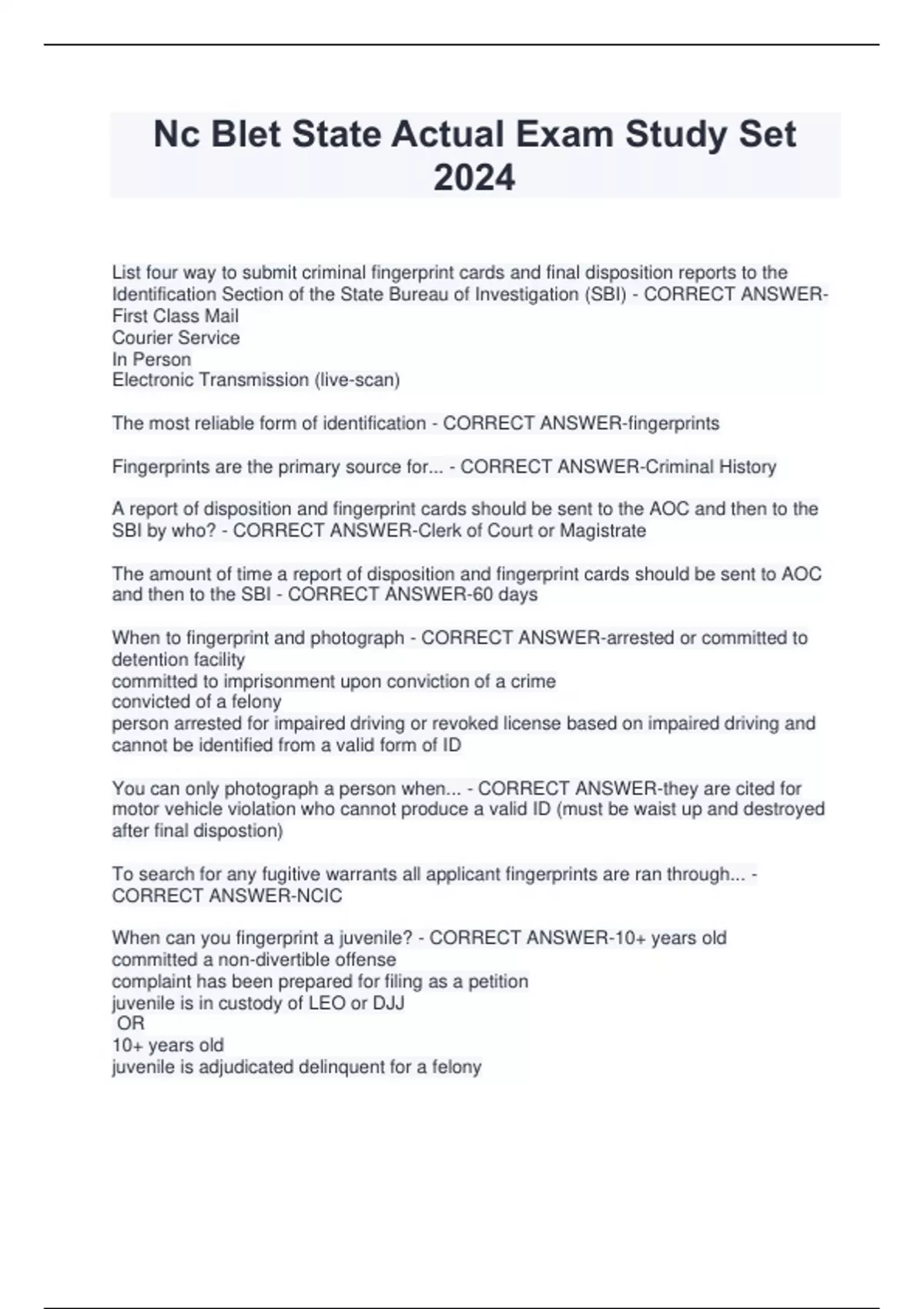 Nc Blet State Actual Exam Study Set 2024 List four way to submit criminal fingerprint cards and final disposition reports to the Identification Section of the State Bureau of Investigation (SBI) - CORRECT ANSWERFirst Class Mail Courier Service In Person Electronic Transmission (live-scan) The most reliable form of identification - CORRECT ANSWER-fingerprints Fingerprints are the primary source for... - CORRECT ANSWER-Criminal History A report of disposition and fingerprint cards should be sent to the AOC and then to the SBI by who? - CORRECT ANSWER-Clerk of Court or Magistrate The amount of time a report of disposition and fingerprint cards should be sent to AOC and then to the SBI - CORRECT ANSWER-60 days When to fingerprint and photograph - CORRECT ANSWER-arrested or committed to detention facility committed to imprisonment upon conviction of a crime convicted of a felony person arrested for impaired driving or revoked license based on impaired driving and cannot be identified from a valid form of ID You can only photograph a person when... - CORRECT ANSWER-they are cited for motor vehicle violation who cannot produce a valid ID (must be waist up and destroyed after final dispostion) To search for any fugitive warrants all applicant fingerprints are ran through... - CORRECT ANSWER-NCIC When can you fingerprint a juvenile? - CORRECT ANSWER-10+ years old committed a non-divertible offense complaint has been prepared for filing as a petition juvenile is in custody of LEO or DJJ OR 10+ years old juvenile is adjudicated delinquent for a felony what are the two types of fingerprints taken - CORRECT ANSWER-rolled prints (from nail to nail) plain for fixed impression (all 4 fingers printed at one time) 3 types of fingerprint patters - CORRECT ANSWER-arch loop whorl 3 purposes of the officer's field notes - CORRECT ANSWER-report writing evidence reference 6 one-word questions that should be answered when developing field notes - CORRECT ANSWER-who what when where why how Field notes are - CORRECT ANSWER-a shorthand writting record made by the LEO from the time they arrived on a scene until an assignment is completed Field notes are used to... - CORRECT ANSWER-reveal inconsistencies basis for final report used as evidence chronology of investigation identify individuals and locations reveal and identify leads ensure admissibility of evidence What should be included in your field notes - CORRECT ANSWER-dates and times officers on scene location weather conditions sketches direct quotes from questioning info for individuals descriptions 4 uses of law enforcement reports - CORRECT ANSWER-record of officer's knowlede communications with others contains statistical information provides information to be used in other criminal investigations 2 types of narratives - CORRECT ANSWER-public confidential records not availible to the public - CORRECT ANS