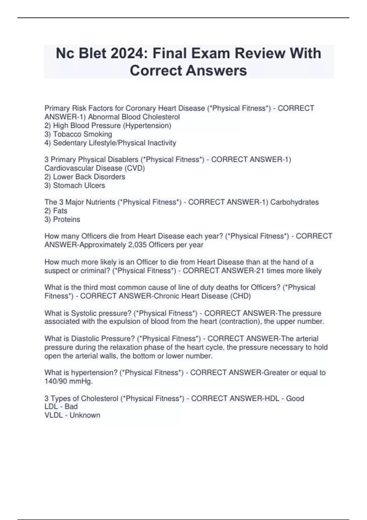 Nc Blet 2024: Final Exam Review With Correct Answers Primary Risk Factors for Coronary Heart Disease (*Physical Fitness*) - CORRECT ANSWER-1) Abnormal Blood Cholesterol 2) High Blood Pressure (Hypertension) 3) Tobacco Smoking 4) Sedentary Lifestyle/Physical Inactivity 3 Primary Physical Disablers (*Physical Fitness*) - CORRECT ANSWER-1) Cardiovascular Disease (CVD) 2) Lower Back Disorders 3) Stomach Ulcers The 3 Major Nutrients (*Physical Fitness*) - CORRECT ANSWER-1) Carbohydrates 2) Fats 3) Proteins How many Officers die from Heart Disease each year? (*Physical Fitness*) - CORRECT ANSWER-Approximately 2,035 Officers per year How much more likely is an Officer to die from Heart Disease than at the hand of a suspect or criminal? (*Physical Fitness*) - CORRECT ANSWER-21 times more likely What is the third most common cause of line of duty deaths for Officers? (*Physical Fitness*) - CORRECT ANSWER-Chronic Heart Disease (CHD) What is Systolic pressure? (*Physical Fitness*) - CORRECT ANSWER-The pressure associated with the expulsion of blood from the heart (contraction), the upper number. What is Diastolic Pressure? (*Physical Fitness*) - CORRECT ANSWER-The arterial pressure during the relaxation phase of the heart cycle, the pressure necessary to hold open the arterial walls, the bottom or lower number. What is hypertension? (*Physical Fitness*) - CORRECT ANSWER-Greater or equal to 140/90 mmHg. 3 Types of Cholesterol (*Physical Fitness*) - CORRECT ANSWER-HDL - Good LDL - Bad VLDL - Unknown What does RICE mean? (*Physical Fitness*) - CORRECT ANSWER-rest, ice, compression, elevation What is diabetes? (*Physical Fitness*) - CORRECT ANSWER-The body's inability of the pancreas to produce or respond properly to the hormone insulin. What Aerobic Exercise and what is its fuel source? (*Physical Fitness*) - CORRECT ANSWER-The primary fuel source for aerobic exercise is fat. 5 Common reasons for back pain/injury? (*Physical Fitness*) - CORRECT ANSWER-1. sedentary to max exertion 2. extra weight on duty belt 3. placement of equipment on duty belt 4. extended periods of sitting and driving 5. incorrect lifting posture 2 common factors contributing to heat injuries? (*Physical Fitness*) - CORRECT ANSWER-a. heat index b. dehydration 4 common causes of stress for officers? (*Physical Fitness*) - CORRECT ANSWER-a. physical b. mental c. emotional d. social 4 injury prevention principles (*Physical Fitness*) - CORRECT ANSWER-a. warm up b. workout c. cool down d. stretch How many calories does each macro nutrient provide? (*Physical Fitness*) - CORRECT ANSWER-Protein-4 calories/gram Carbohydrates-4 calories/gram Fats-9 calories/gram What is the primary source of fuel for anaerobic fitness? (*Physical Fitness*) - CORRECT ANSWER-Carbohydrate What is the FIT mean in relation to a workout? (*Physical Fitness*) - CORRECT ANSWER--Frequency-to promote and maintain health -Intensity-determined by directly measuring oxygen consumption (heart rate) -Time(Duration)-the length of the session (inversely related to intensity) What does Morals mean? (*Ethics*) - CORRECT ANSWER-Principles of right and wrong