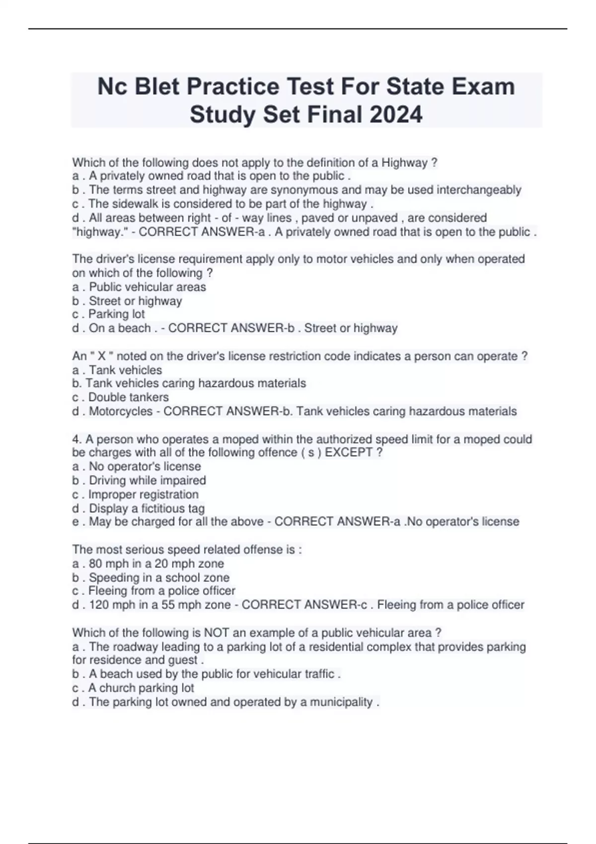 Nc Blet Practice Test For State Exam Study Set Final 2024 Which of the following does not apply to the definition of a Highway ? a . A privately owned road that is open to the public . b . The terms street and highway are synonymous and may be used interchangeably c . The sidewalk is considered to be part of the highway . d . All areas between right - of - way lines , paved or unpaved , are considered "highway." - CORRECT ANSWER-a . A privately owned road that is open to the public . The driver's license requirement apply only to motor vehicles and only when operated on which of the following ? a . Public vehicular areas b . Street or highway c . Parking lot d . On a beach . - CORRECT ANSWER-b . Street or highway An " X " noted on the driver's license restriction code indicates a person can operate ? a . Tank vehicles b. Tank vehicles caring hazardous materials c . Double tankers d . Motorcycles - CORRECT ANSWER-b. Tank vehicles caring hazardous materials 4. A person who operates a moped within the authorized speed limit for a moped could be charges with all of the following offence ( s ) EXCEPT ? a . No operator's license b . Driving while impaired c . Improper registration d . Display a fictitious tag e . May be charged for all the above - CORRECT ANSWER-a .No operator's license The most serious speed related offense is : a . 80 mph in a 20 mph zone b . Speeding in a school zone c . Fleeing from a police officer d . 120 mph in a 55 mph zone - CORRECT ANSWER-c . Fleeing from a police officer Which of the following is NOT an example of a public vehicular area ? a . The roadway leading to a parking lot of a residential complex that provides parking for residence and guest . b . A beach used by the public for vehicular traffic . c . A church parking lot d . The parking lot owned and operated by a municipality . e. Private property that is not a matter of right - of - way and not opened to or generally used by the public . - CORRECT ANSWER-e. Private property that is not a matter of right - of - way and not opened to or generally used by the public . A person who changes addresses with the State of NC must obtain a valid license showing the correct address within ___ days: a. 60 b . 30 c. 180 d . 90 - CORRECT ANSWER-a. 60 8. Which of the following is TRUE regarding mopeds ? a . Persons under the age of 16 are prohibited from operating a moped on a highway or public vehicular area . b . A moped is not required to be registered in NC . c. No operator's license is required to operate a moped on a street or highway . d. A and C only . - CORRECT ANSWER-d. A and C only . Who is exempt from the license requirement in NC ? a . A person at least 15 years of age b . A person who has been a resident for more the 6 months c. Military personnel operating a motor vehicle which is the property of the Armed Forces of the United States . d . A student that has maintained an address in NC for six months or more . - CORRECT ANSWER-c. Military personnel operating a motor vehicle which is the property of the Armed Forces of the United States . It is unlawful for a person less than ___ years of age to operate a motor vehicle on a highway or public vehicular area while consuming alcohol . a . 16 b . 18 c. 21 d . 20 - CORRECT ANSWER-c. 21 Where can a person under the age of 16 lawfully ride a moped a . Public street b . Highway c. Private property d . None of the above - CORRECT ANSWER-c. Private property Which of the following apply to child restraints systems ? a . All passengers under the age of 16 years of age must be secured in a child passenger restraint system or a seat belt . b . This statue governing child restraint systems applies to vehicles operating on streets , highways and public vehicular areas . c. Ambulances and emergency vehicle are not exempt d . All the above e . A and B only - CORRECT ANSWER-e . A and B only Who is authorized to issue limited driving privileges ? a . Trial judge b . Magistrate c . Clerk of Court d . District Attorney - CORRECT ANSWER-a . Trial judge Which of the following requires a separate license endorsement to operate ? a . School bus b . Motorcycle c. Commercial Motor Vehicle d . None of the above - CORRECT ANSWER-b . Motorcycle How many points are deducted from a driver's license for a conviction of a violation of passing a stopped school bus ? a. 5 b. 4 c. 6 d . None of the above - CORRECT ANSWER-a. 5 If a driver receives ___ points within a three year period , DMV may revoke the driver's license ? a . 10 b . 5 C. 8 d . 12 - CORRECT ANSWER-d . 12 Where can you not charge a person with driving while impaired ? a . Public Street b . Private Property c. Public Vehicular Area d . Highway - CORRECT ANSWER-b . Private Property What is the purpose of submitting a driver's license reexamination form ? a . To have DMV revoke the operator's license b . To have DMV require the operator to get a physical c . To have a judge require the operator to get a physical d . To have DMV reexamine the operator to determine their fitness and ability to operate a motor vehicle . - CORRECT ANSWER-d . To have DMV reexamine the operator to determine their fitness and ability to operate a motor vehicle . The best evidence rule refers to : a . The use of circumstantial evidence . b . Testimony of witnesses