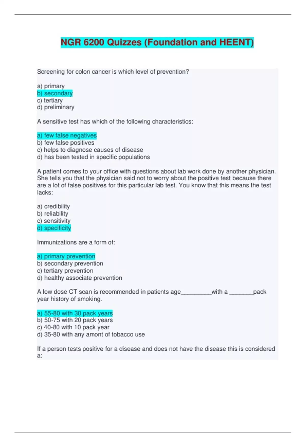 NGR 6200 Quizzes (Foundation and HEENT) - Complete Solutions Screening for colon cancer is which level of prevention? a) primary b) secondary c) tertiary d) preliminary A sensitive test has which of the following characteristics: a) few false negatives b) few false positives c) helps to diagnose causes of disease d) has been tested in specific populations A patient comes to your office with questions about lab work done by another physician. She tells you that the physician said not to worry about the positive test because there are a lot of false positives for this particular lab test. You know that this means the test lacks: a) credibility b) reliability c) sensitivity d) specificity Immunizations are a form of: a) primary prevention b) secondary prevention c) tertiary prevention d) healthy associate prevention A low dose CT scan is recommended in patients age_________with a _______pack year history of smoking. a) 55-80 with 30 pack years b) 50-75 with 20 pack years c) 40-80 with 10 pack year d) 35-80 with any amont of tobacco use If a person tests positive for a disease and does not have the disease this is considered a: a) false positive b) true positive c) false negative d) true negative Screening is considered a form of: a) health counseling b) primary prevention c) secondary prevention d) tertiary intervention Current recommendations for HIV screening include: a) all heterosexual males b) only those individuals with risk factors c) those individuals with a history of sexually d) transmitted diseases e) all individuals can be screened Sending a patient for rehabilitation after a stroke is an example of: a) primary prevention b) tertiary prevention c) secondary prevention d) rehab prevention Which of the following statements is true according to the USPSTF: a) all individuals age 65 and older should be screened for thyroid disease b) cholesterol should be measured yearly in spite of normal values c) PAP tests are done in all women until age 75 d) colorectal screening should begin at age 50 The U.S. government report, Healthy People 2020, has over all goals for a healthy society. Which of the following are measures to assess achievement of the goals: (Select all that apply) a) attain high quality, longer lives free of preventable disease, disability, injury, and premature death b) achieve health equity and eliminate disparities c) create social and physical environments that promote health d) promote quality of life across all stages of life e) all of the above Thomas Kincaid is a 72 year old black Jamaican male. He tells you he has not been to see a medical provider in 25 years and asks for a complete physical. You do the physical which appears normal and draw labs including a PSA because of urinary complaints. The labs come back normal except for the PSA which was 45. When Mr. Kincaid comes for his follow-up you advise him that his PSA is elevated and that you want him to see a urologist. Mr. Kincaid tells you that he does not like doctors and he believes that God will do whatever is best for him so he need not worry. Select the most appropriate response. Without proper treatment, death can ensue. Urgent consultation and treatment are required. a) I understand your religious beliefs and confidence in God's power. Perhaps we can talk to your clergy to see how medical treatment can be considered as God's plan. b) I understand and will support you in this decision regardless of the end result. c) I will not be able to provide care unless you are willing to receive treatment at this time. d) understand and will support you in this decision regardless of the end result. e) I will not be able to provide care unless you are willing to receive treatment at this time. The rapid strep test is up to 95% sensitive and 99% specific. The NP understands that this means the following: (select all that apply). a) 5% of individuals with strep throat will test negative (false negative) b) 1% of individuals without strep will have a positive test (false positive) c) The rapid strep test is more specific than sensitive, a highly sensitive test has few false positives d) A highly sensitive test has few false positives Mammography has a sensitivity of 85% and a specificity of 90%. The NP understands the following: (select all that apply) Please read the comments at the end of the question once submitted. a) 15% of women with breast cancer will not be detected with mammography b) 10% of women without breast cancer will receive false positive results c) False positive results cause anxiety d) False negative tests highly desired