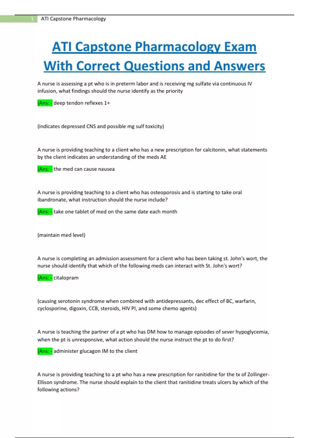 ATI Capstone Pharmacology Exam With Correct Questions and Answers A nurse is assessing a pt who is in preterm labor and is receiving mg sulfate via continuous IV infusion, what findings should the nurse identify as the priority {Ans: - deep tendon reflexes 1+ (indicates depressed CNS and possible mg sulf toxicity) A nurse is providing teaching to a client who has a new prescription for calcitonin, what statements by the client indicates an understanding of the meds AE {Ans: - the med can cause nausea A nurse is providing teaching to a client who has osteoporosis and is starting to take oral ibandronate, what instruction should the nurse include? {Ans: - take one tablet of med on the same date each month (maintain med level) A nurse is completing an admission assessment for a client who has been taking st. John's wort, the nurse should identify that which of the following meds can interact with St. John's wort? {Ans: - citalopram (causing serotonin syndrome when combined with antidepressants, dec effect of BC, warfarin, cyclosporine, digoxin, CCB, steroids, HIV PI, and some chemo agents) A nurse is teaching the partner of a pt who has DM how to manage episodes of sever hypoglycemia, when the pt is unresponsive, what action should the nurse instruct the pt to do first? {Ans: - administer glucagon IM to the client