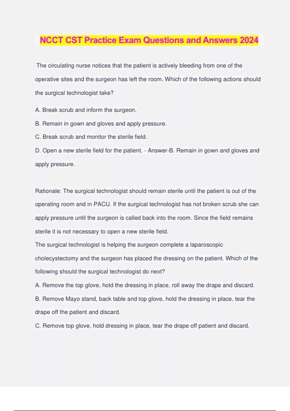 NCCT CST Practice Exam Questions and Answers 2024 The circulating nurse notices that the patient is actively bleeding from one of the operative sites and the surgeon has left the room. Which of the following actions should the surgical technologist take? A. Break scrub and inform the surgeon. B. Remain in gown and gloves and apply pressure. C. Break scrub and monitor the sterile field. D. Open a new sterile field for the patient. - Answer-B. Remain in gown and gloves and apply pressure. Rationale: The surgical technologist should remain sterile until the patient is out of the operating room and in PACU. If the surgical technologist has not broken scrub she can apply pressure until the surgeon is called back into the room. Since the field remains sterile it is not necessary to open a new sterile field. The surgical technologist is helping the surgeon complete a laparoscopic cholecystectomy and the surgeon has placed the dressing on the patient. Which of the following should the surgical technologist do next? A. Remove the top glove, hold the dressing in place, roll away the drape and discard. B. Remove Mayo stand, back table and top glove, hold the dressing in place, tear the drape off the patient and discard. C. Remove top glove, hold dressing in place, tear the drape off patient and discard. D. Remove the Mayo stand, back table and top glove, hold the dressing in place, roll away the drape and discard. - Answer-D. Remove the Mayo stand, back table and top glove, hold the dressing in place, roll away the drape and discard. Rationale: The Mayo stand and back table need to remain sterile until the patient is out of the room. The top gloves need replaced to prohibit any debris from getting the dressing dirty. By holding the dressing on with the clean gloves the drape can be removed so any biohazardous materials are contained within the drapes and discarded. A tornado warning is in effect and power has been switched to the generator due to downed electrical lines. The hospital's disaster triage protocol has been activated. A surgical procedure is in progress. Which of the following is the best course of action to ensure patient safety? A. Immediately evacuate the patient to the preoperative holding area. B. Finish the procedure and evacuate the patient. C. Place wet towels under door and finish the procedure. D. Cover the back table until the storm passes. - Answer-B. Finish the procedure and evacuate the patient. Rationale: Follow hospital's disaster plan for tornado preparedness and response. Under Joint Commissions standard codes, this would be categorized as a Code Brown, which is a weather related emergency. The best option in this instance is to complete the case, and then transfer the patient to a safe location for post-operative care. Upon opening a sterilized instrument tray, the surgical technologist finds bioburden inside the lumen of a metal suction. Which of the following actions should the surgical technologist take? A. Isolate the sterilized suction, then flush the bioburden with sterile water. B. Remove the sterilized suction from the sterile field. C. Isolate the sterilized suction on the sterile field with a sterile towel. D. Remove the sterilized instrument tray from the sterile field. - Answer-D. Remove the sterilized instrument tray from the sterile field. Rationale: The surgical technologist should check and inspect instruments. If bioburden is found, the whole tray should be discarded and handed off. (When in doubt throw it out.) The tray should not be left on the sterile field at all, or cleaned on the sterile field, because it would make the field contaminated. While preparing the room for a surgical procedure using the laser, which of the following policies ensure the laser is being used correctly? (Select the three (3) correct answers.) A. Have laparotomy sponges available. B. Post warning signs outside the room C. Place the foot control next to the circulator. D. Do not use alcohol based preps. E. Wear safety goggles. - Answer-B. Post warning signs outside the room. D. Do not use alcohol based preps. E. Wear safety goggles. Rationale: Posting warning signs will prevent surgery doors from opening and causing unnecessary harm to co-workers outside the room. Not using alcohol based preps will decrease the risk of surgical fires. Safety goggles approved for that specific laser will prevent injury to the eye. Laparotomy sponges should be wet if available. The doctor should be in control of the foot control pedal to the laser. During a vaginal hysterectomy the surgical team noticed that the safety belt was left off the patient before the drape was applied and discovered after draping. How can the patient be secured to the OR bed without interrupting the sterile field or procedure? A. The surgical technologist can watch for movement of the patient and inform the circulator. B. The anesthesiologist can secure the head to prevent shifting. C. The circulator can reach under the sterile drape and apply the safety strap. D. The surgeon can request sterile coban to secure the patient. - Answer-C. The circulator can reach under the sterile drape and apply the safety strap. Rationale: The underside of the drape is not sterile, therefore, can be touched by the unsterile circulating nurse, while she secures the patient with the safety strap. The surgical team is at the surgical field and has just completed the time-out. The surgeon turns to the surgical technologist and asks for local. Which of the following actions should the surgical technologist take next before passing the local? A. Read aloud the medication label on the syringe. B. Pass the correctly labeled medication syringe. C. Confirm with the circulator the medication label on the syringe. D. Confirm with the anesthesiologist the medication on the syringe. - Answer-A. Read aloud the medication label on the syringe. Rationale: The medication has already been verified by the circulator and the surgical technologist upon pl