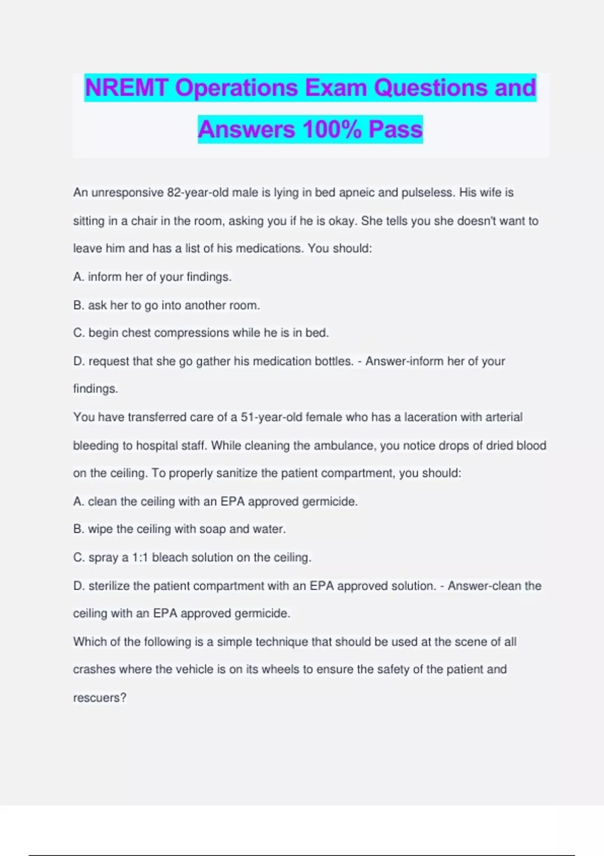 NREMT Operations Exam Questions and Answers 100% Pass An unresponsive 82-year-old male is lying in bed apneic and pulseless. His wife is sitting in a chair in the room, asking you if he is okay. She tells you she doesn't want to leave him and has a list of his medications. You should: A. inform her of your findings. B. ask her to go into another room. C. begin chest compressions while he is in bed. D. request that she go gather his medication bottles. - Answer-inform her of your findings. You have transferred care of a 51-year-old female who has a laceration with arterial bleeding to hospital staff. While cleaning the ambulance, you notice drops of dried blood on the ceiling. To properly sanitize the patient compartment, you should: A. clean the ceiling with an EPA approved germicide. B. wipe the ceiling with soap and water. C. spray a 1:1 bleach solution on the ceiling. D. sterilize the patient compartment with an EPA approved solution. - Answer-clean the ceiling with an EPA approved germicide. Which of the following is a simple technique that should be used at the scene of all crashes where the vehicle is on its wheels to ensure the safety of the patient and rescuers? A. Disconnecting the battery B. Allowing the capacitor in airbags to discharge C. Ensuring the vehicle is in Park and turned off D. Cribbing the vehicle and deflating the tires - Answer-Ensuring the vehicle is in Park and turned off Which of the following strategies should be used to make responding to 9-1-1 calls safer? A. Use GPS mapping systems to determine the quickest route of travel. B. When responding with other emergency vehicles, use multiple routes of travel. C. Reduce following distances when using law enforcement escorts. D. Minimize the use of lights and siren responses. - Answer-Minimize the use of lights and siren responses. You are at the hospital cleaning your ambulance after transporting a 62-year-old female from a car crash. The law enforcement officer who was on the scene of the crash asks you for the patient's name and date of birth. You should: A. tell him that he needs to speak to the hospital staff. B. direct him to your agency's Privacy Officer. C. provide the information. D. tell him you cannot provide it because it is a HIPAA violation. - Answer-provide the information. Which of the following actions can significantly reduce the risk of cross-contamination from a patient exposed to toxic gas? A. Don an N-95 respirator. B. Don Level D PPE protection. C. Have the patient remove their clothing. D. Administer oxygen by non-rebreather mask. - Answer-Have the patient remove their clothing. Which of the following is a public health activity of an EMS system to maintain community relations? A. Conducting an initial EMT class B. Hosting a regional protocol skills review C. Installing car seats D. Participating in a disaster drill - Answer-Installing car seats You suspect that a 72-year-old male that you transported to the hospital has been abused. You should: A. collect evidence at the scene and transport it with you to the hospital in a plastic bag. B. report your observations to the receiving facility. C. question his caregiver about why he is abused. D. inform the receiving facility that he is being abused by his caregiver. - Answer-report your observations to the receiving facility. You are the first ambulance to arrive on the scene of an overturned school bus on a limited-access highway. You see several people on the bus. You should first: A. establish command. B. request a helicopter to respond to the scene. C. set up a staging area. D. begin triage. - Answer-establish command. Which of the following is a public health activity that an EMS agency can take to prepare their community in case there is a mass shooting event? A. Ensuring all providers receive Tactical Emergency Casualty Care training B. Stocking multiple tourniquets on all service vehicles C. Conducting Stop the Bleed classes for the community Your answer is correct. D. Working with a local hospital to develop Emergency Response Plans - Answer- Conducting Stop the Bleed classes for the community You have transported a 29-year-old male who complained of difficulty breathing to the hospital. Prior to leaving the hospital, at the very least, you should: A. transfer care to staff with an equal or higher level of training. B. ensure that all supplies used are restocked. C. provide patient demographic information to the registration staff. D. complete an electronic patient care report. - Answer-transfer care to staff with an equal or higher level of training. When using radio communications, you should: A. place the microphone less than one inch in front of your lips. B. speak quickly. C. press the talk button and begin speaking immediately. D. avoid codes. - Answer-avoid codes. Which of the following influences a study when the outcomes are manipulated to fit an expected outcome instead of measured objectively against the hypothesis? A. Bias