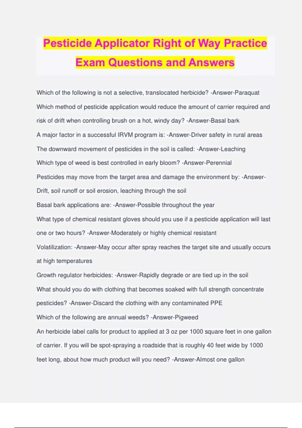 Pesticide Applicator Right of Way Practice Exam Questions and Answers Which of the following is not a selective, translocated herbicide? -Answer-Paraquat Which method of pesticide application would reduce the amount of carrier required and risk of drift when controlling brush on a hot, windy day? -Answer-Basal bark A major factor in a successful IRVM program is: -Answer-Driver safety in rural areas The downward movement of pesticides in the soil is called: -Answer-Leaching Which type of weed is best controlled in early bloom? -Answer-Perennial Pesticides may move from the target area and damage the environment by: -Answer- Drift, soil runoff or soil erosion, leaching through the soil Basal bark applications are: -Answer-Possible throughout the year What type of chemical resistant gloves should you use if a pesticide application will last one or two hours? -Answer-Moderately or highly chemical resistant Volatilization: -Answer-May occur after spray reaches the target site and usually occurs at high temperatures Growth regulator herbicides: -Answer-Rapidly degrade or are tied up in the soil What should you do with clothing that becomes soaked with full strength concentrate pesticides? -Answer-Discard the clothing with any contaminated PPE Which of the following are annual weeds? -Answer-Pigweed An herbicide label calls for product to applied at 3 oz per 1000 square feet in one gallon of carrier. If you will be spot-spraying a roadside that is roughly 40 feet wide by 1000 feet long, about how much product will you need? -Answer-Almost one gallon Risks involved with the use of soil sterilant include: -Answer-Movement of the pesticide off-site into ground water Your company is using a new herbicide for treating persistent weeds. The signal word is DANGER. What measure should you take to minimize potential harm to yourself and coworkers? -Answer-Be familiar with the poisoning symptoms Most exposure to pesticide concentrates occurs to this part of the applicator's body: - Answer-Skin