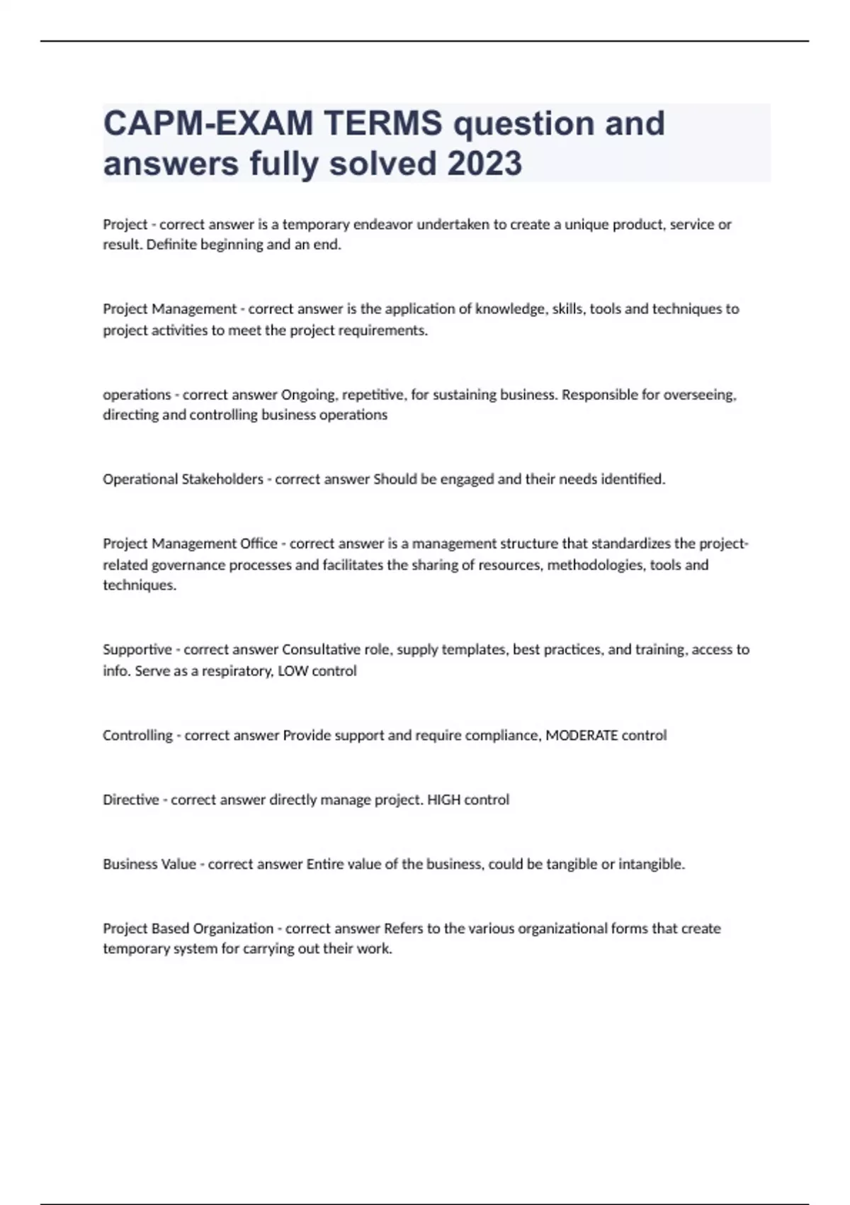 CAPM-EXAM TERMS question and answers rated A+ 2024Project - correct answer is a temporary endeavor undertaken to create a unique product, service or result. Definite beginning and an end. Project Management - correct answer is the application of knowledge, skills, tools and techniques to project activities to meet the project requirements. operations - correct answer Ongoing, repetitive, for sustaining business. Responsible for overseeing, directing and controlling business operations Operational Stakeholders - correct answer Should be engaged and their needs identified. Project Management Office - correct answer is a management structure that standardizes the project-related governance processes and facilitates the sharing of resources, methodologies, tools and techniques. Supportive - correct answer Consultative role, supply templates, best practices, and training, access to info. Serve as a respi