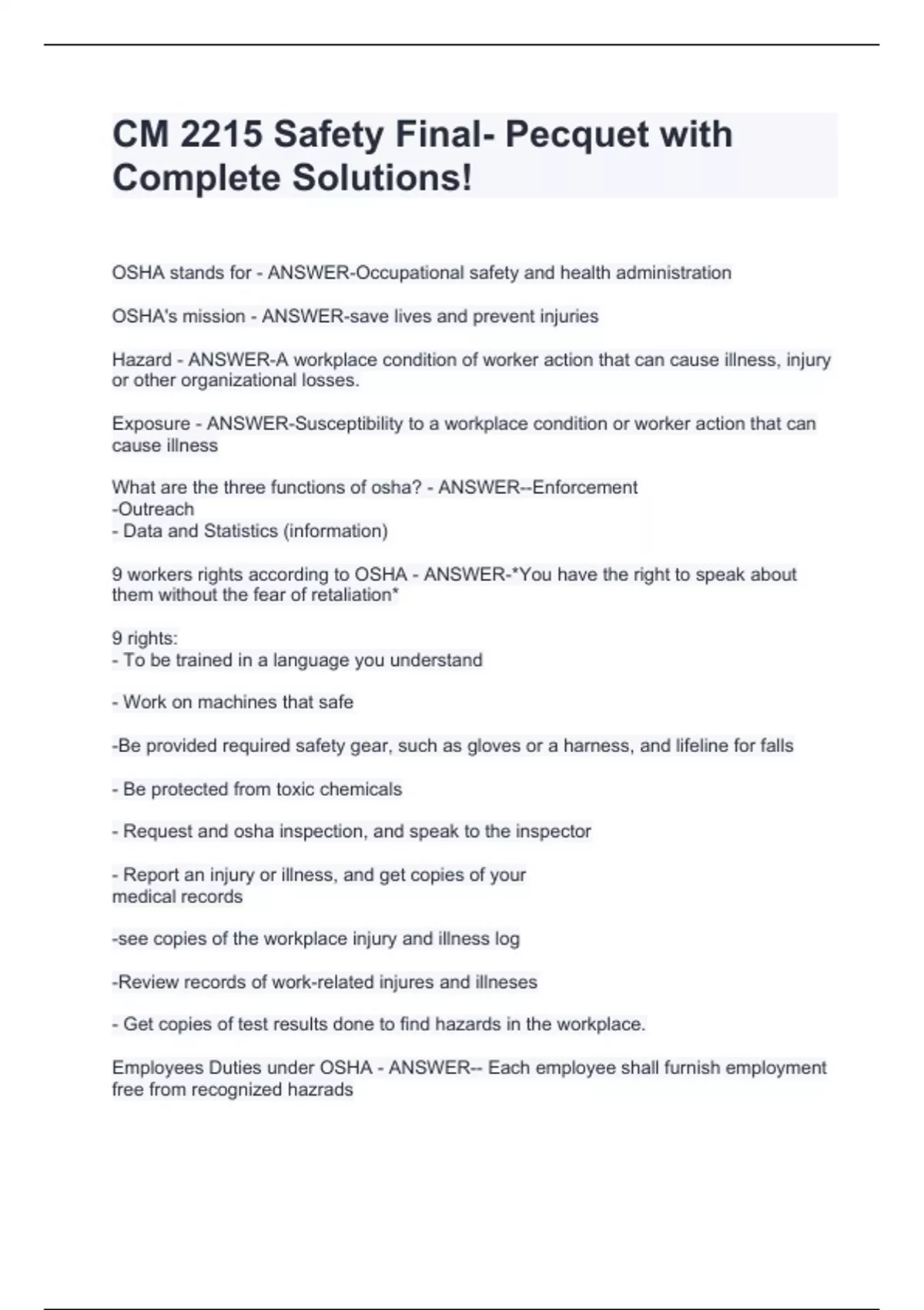 CM 2215 Safety Final- Pecquet with Complete Solutions!