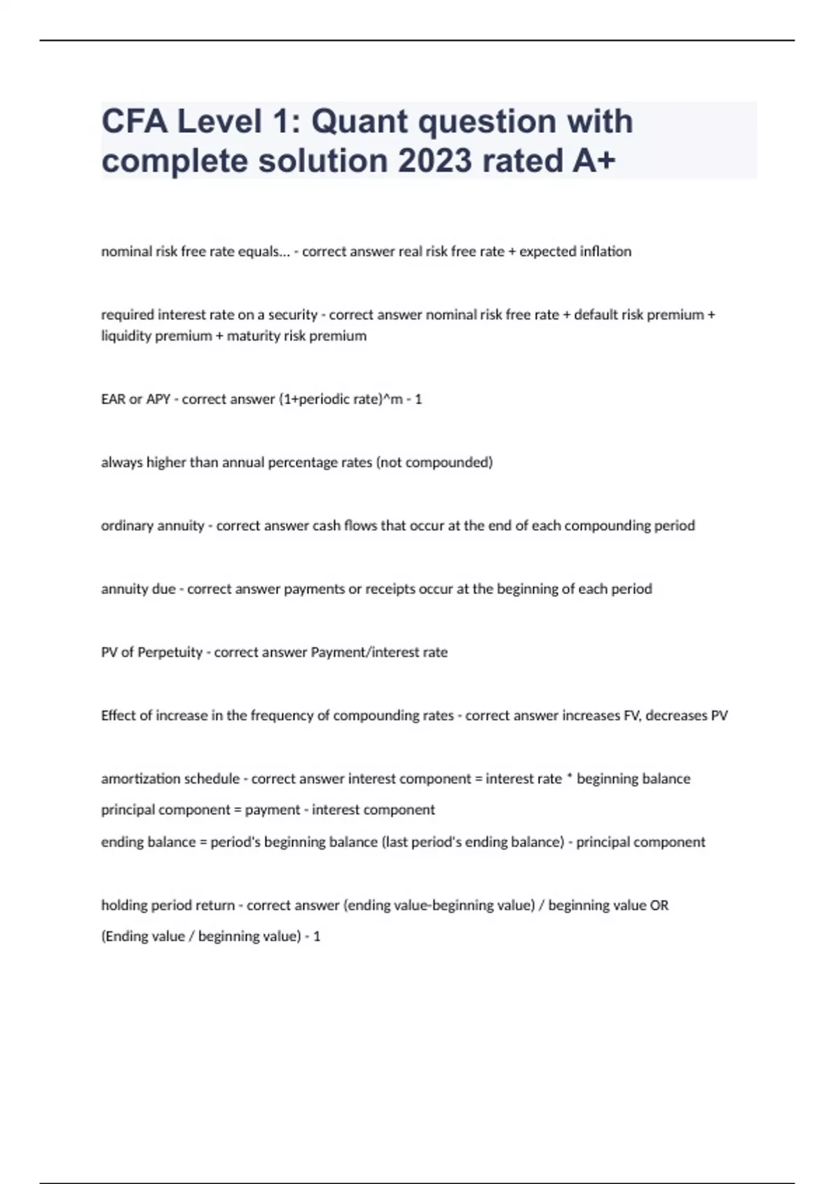 CFA Level 1 Quant question and answers 2024 verified to passnominal risk free rate equals... - correct answer real risk free rate + expected inflation required interest rate on a security - correct answer nominal risk free rate + default risk premium + liquidity premium + maturity risk premium EAR or APY - correct answer (1+periodic rate)^m - 1 always higher than annual percentage rates (not compounded) ordinary annuity - correct answer cash flows that occur at the end of each compounding period annuity due - correct answer payments or receipts occur at the beginning of each period PV of Perpetuity - correct answer Payment/interest rate Effect of increase in the frequency of compounding rates - correct answer increases FV, decreases PV