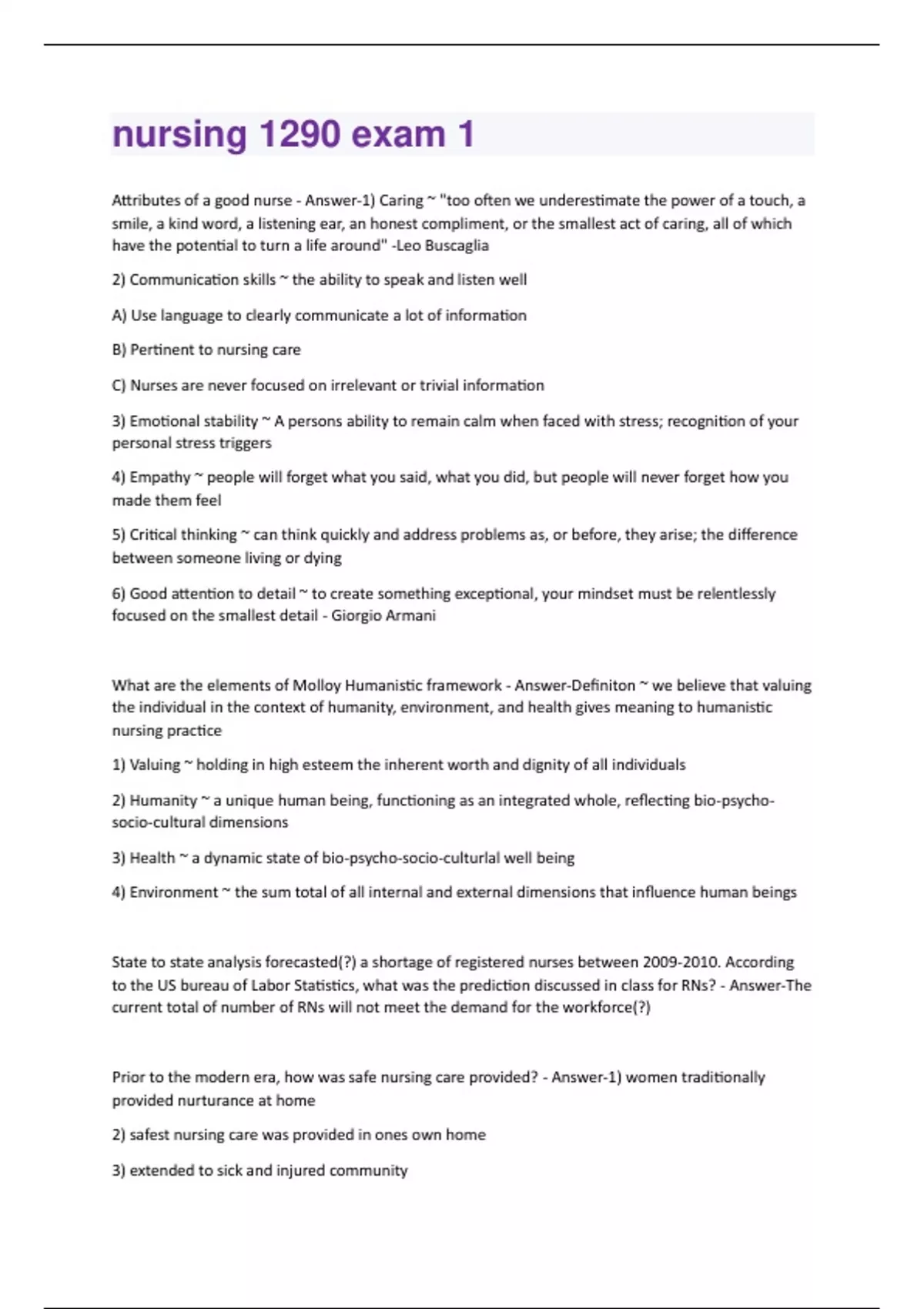 Attributes of a good nurse - Answer-1) Caring ~ "too often we underestimate the power of a touch, a smile, a kind word, a listening ear, an honest compliment, or the smallest act of caring, all of which have the potential to turn a life around" -Leo Buscaglia 2) Communication skills ~ the ability to speak and listen well A) Use language to clearly communicate a lot of information B) Pertinent to nursing care C) Nurses are never focused on irrelevant or trivial information 3) Emotional stability ~ A persons ability to remain calm when faced with stress; recognition of your personal stress triggers 4) Empathy ~ people will forget what you said, what you did, but people will never forget how you made them feel 5) Critical thinking ~ can think quickly and address problems as, or before, they arise; the difference between someone living or dying 6) Good attention to detail ~ to create something exceptional, your mindset must be relentlessly focused on the smallest detail - Giorgio Armani What are the elements of Molloy Humanistic framework - Answer-Definiton ~ we believe that valuing the individual in the context of humanity, environment, and health gives meaning to humanistic nursing practice 1) Valuing ~ holding in high esteem the inherent worth and dignity of all individuals 2) Humanity ~ a unique human being, functioning as an integrated whole, reflecting bio-psychosocio-cultural dimensions 3) Health ~ a dynamic state of bio-psycho-socio-culturlal well being 4) Environment ~ the sum total of all internal and external dimensions that influence human beings State to state analysis forecasted(?) a shortage of registered nurses between . According to the US bureau of Labor Statistics, what was the prediction discussed in class for RNs? - Answer-The current total of number of RNs will not meet the demand for the workforce(?) Prior to the modern era, how was safe nursing care provided? - Answer-1) women traditionally provided nurturance at home 2) safest nursing care was provided in ones own home 3) extended to sick and injured community4) other societies included medicine men, shamans, and other male tribe members 5) no formal training - learned through oral traditions, passed from one generation to another, usually by trial and error. those with success were considered experts Throughout the years, what influences the practice of nursing? - Answer-tradition, authority, clinical experience and intuition, logical reasoning, and disciplined research Role of Deconess - Answer-The first visiting nurses Kaiserwerth Deaconess Institute - Answer-- Hospital and medical school with a 3 year course of study for Protestant deaconesses, including training in nursing, pharmacy, and teaching; - considered the most significant early - Protestant nursing organization. - opened by pastor theodur fliedur Who was the most famous student of Kaiserwerth - Answer-Florence Nightingale Mary Breckinridge - Answer-Frontier Nursing Service (FNS) A) established in 1925 B) healthcare to women and their families in rural Kentucky C) educated as nurse midwife in england D) started first school of midwifery in the US in 1939 E) between ~ 17053 berths and 11 maternal deaths = well below national average F) beginning of pre-natal care G) inducted into ANA' hall of fame contributions of women, community, and family nursing and rural health care delivery Isabel Robb - Answer-1) competencies needed to be proven in order to receive qualifications 2) first president of ANA 3) organized nursing school superintendents which became the National League of Nurses 4) member of the committee to form the AJN Dorothea Dix - Answer-1) appointed to organize military hospitals, provide trained nurses (nurse recruiter), and disperse supplies2) received official status and no salary for this position 3) fought for rights of the mentally ill 4) 6 million people hospitalized during the war- one half million surgical cases; 2000 nurses served in the war 5) most effective advice of the 19th century Florence Nightingale - Answer-1) founder of modern nursing 2) established the fort nursing philosophy based on health maintenance and restoration 3) first practicing nurse epidemiologist 4) first nurse researcher 5) changed society's views of nurses 6) traveled to Crimea for the war 7) "notes of nursing" ~ pure air, pure water, efficient drainage, cleanliness, and light 8) body and mood as separate entities and basis of holistic view of health; data and. outcomes; nursing research and evidence based practice 9) the nurse who could improve the health of her patients by increasing airflow and encouraging hand washing 10) established a reputation that allowed her to improve nursing standards; the beginning of professional nursing education 11) established a training school for nurses at the infirmary in london; provided theory-based knowledge and clinical skill-building 12) encourages the belief that there is a body of nursing knowledge distinct from medical knowledge Negative: 1) delayed the development of the profession 2) failing to encourage nursing education offered at a university level 3) delaying licensure Lillian Wald - Answer-1) Champion of the urban poor 2) Established Henry Street Settlement in 1893 which became New York Visiting Nursing Services 3) Pioneer in Public Health Nursing 4) providing care for neighbors illnesses 5) assisting with births and deaths6) wald and her colleagues became the first public health nurses in the country 7) health of the community affected the health of the individual 8) improve lives of women, children, and her focus was on the immigrant families 9) improve working conditions fir women 10) abolish child labor and helped to found the Federal Children's Bureau Clara Barton - Answer-1) was concerned about the condition of wounded soldiers on the battlefield 2) brought supplies and nursed the wounded on the front 3) inspired by International Red Cross to form American Red Cross in 1881 Susie Walking Bear Yellowtail - 