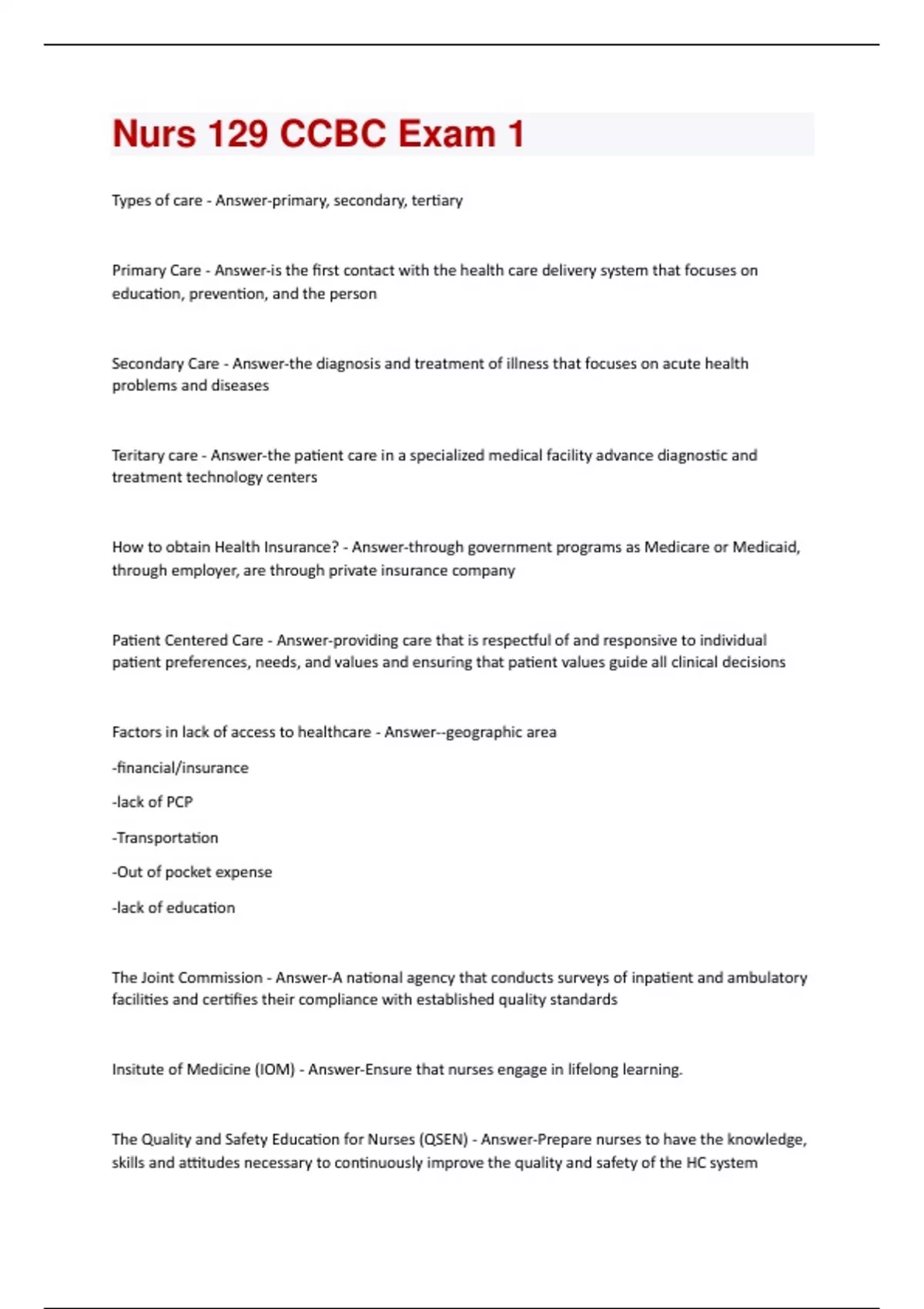 Types of care - Answer-primary, secondary, tertiary Primary Care - Answer-is the first contact with the health care delivery system that focuses on education, prevention, and the person Secondary Care - Answer-the diagnosis and treatment of illness that focuses on acute health problems and diseases Teritary care - Answer-the patient care in a specialized medical facility advance diagnostic and treatment technology centers How to obtain Health Insurance? - Answer-through government programs as Medicare or Medicaid, through employer, are through private insurance company Patient Centered Care - Answer-providing care that is respectful of and responsive to individual patient preferences, needs, and values and ensuring that patient values guide all clinical decisions Factors in lack of access to healthcare - Answer--geographic area -financial/insurance -lack of PCP -Transportation -Out of pocket expense -lack of education The Joint Commission - Answer-A national agency that conducts surveys of inpatient and ambulatory facilities and certifies their compliance with established quality standards Insitute of Medicine (IOM) - Answer-Ensure that nurses engage in lifelong learning. The Quality and Safety Education for Nurses (QSEN) - Answer-Prepare nurses to have the knowledge, skills and attitudes necessary to continuously improve the quality and safety of the HC systemAmerican Nurse Association (ANA) - Answer-Professional organization that represents all registered nurses American Nurses Credentialing Center (ANCC) - Answer-An independent agency of the American Nurses Association that conducts certification examinations and certifies advanced practice nurses. International Council of Nurses (ICN) - Answer-Professional organization that represents nurses in countries around the world. National Council of State Boards of Nursing (NCSBN) - Answer-An organization whose membership consists of the board of nursing of each state or territory to provide templates for states to follow -administer NCLEX And develop NCLEX State Board of Nursing (BON) - Answer-Appointed board within each state charged with responsibility to administer the nurse practice act of that state. Licensure by endorsement - Answer-a nurse licensed in one state can seek licensure in another state without repeating the NCLEX Compact States - Answer-a state establishes agreement to allow nurses to practice in the state without additional licenses Certifications - Answer-The process by which nurses are recognized for advanced education and competence and awarded by nongovernment agencies