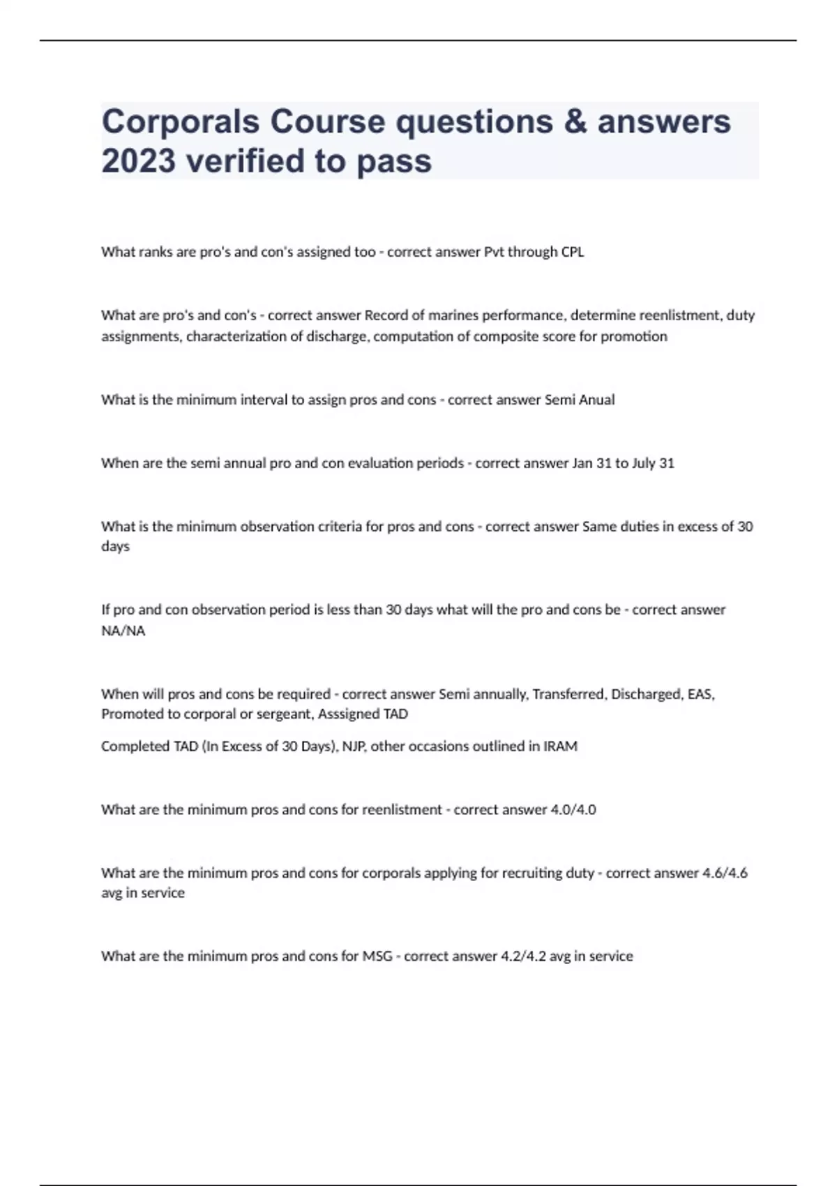 Corporals Course questions & answers already passed 2024 What ranks are pro's and con's assigned too - correct answer Pvt through CPL What are pro's and con's - correct answer Record of marines performance, determine reenlistment, duty assignments, characterization of discharge, computation of composite score for promotion What is the minimum interval to assign pros and cons - correct answer Semi Anual When are the semi annual pro and con evaluation periods - correct answer Jan 31 to July 31 What is the minimum observation criteria for pros and cons - correct answer Same duties in excess of 30 days If pro and con observation period is less than 30 days what will the pro and cons be - correct answer NA/NA When will pros and cons be required - correct answer Semi annually, Transferred, Discharged, EAS, Promoted to corporal or sergeant, Asssigned TAD Completed TAD (In Excess of 30 Days), NJP, other occasions outlined in IRAM What are the minimum pros and cons for reenlistment - correct answer 4.0/4.0 What are the minimum pros and cons for corporals applying for recruiting duty - correct answer 4.6/4.6 avg in service What are the minim