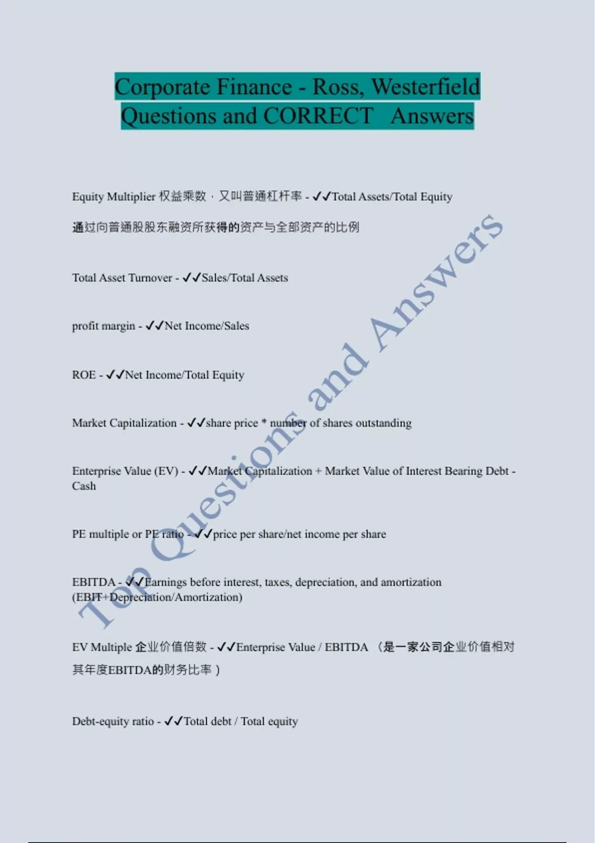 Corporate Finance - Ross, Westerfield Questions and CORRECT Answers