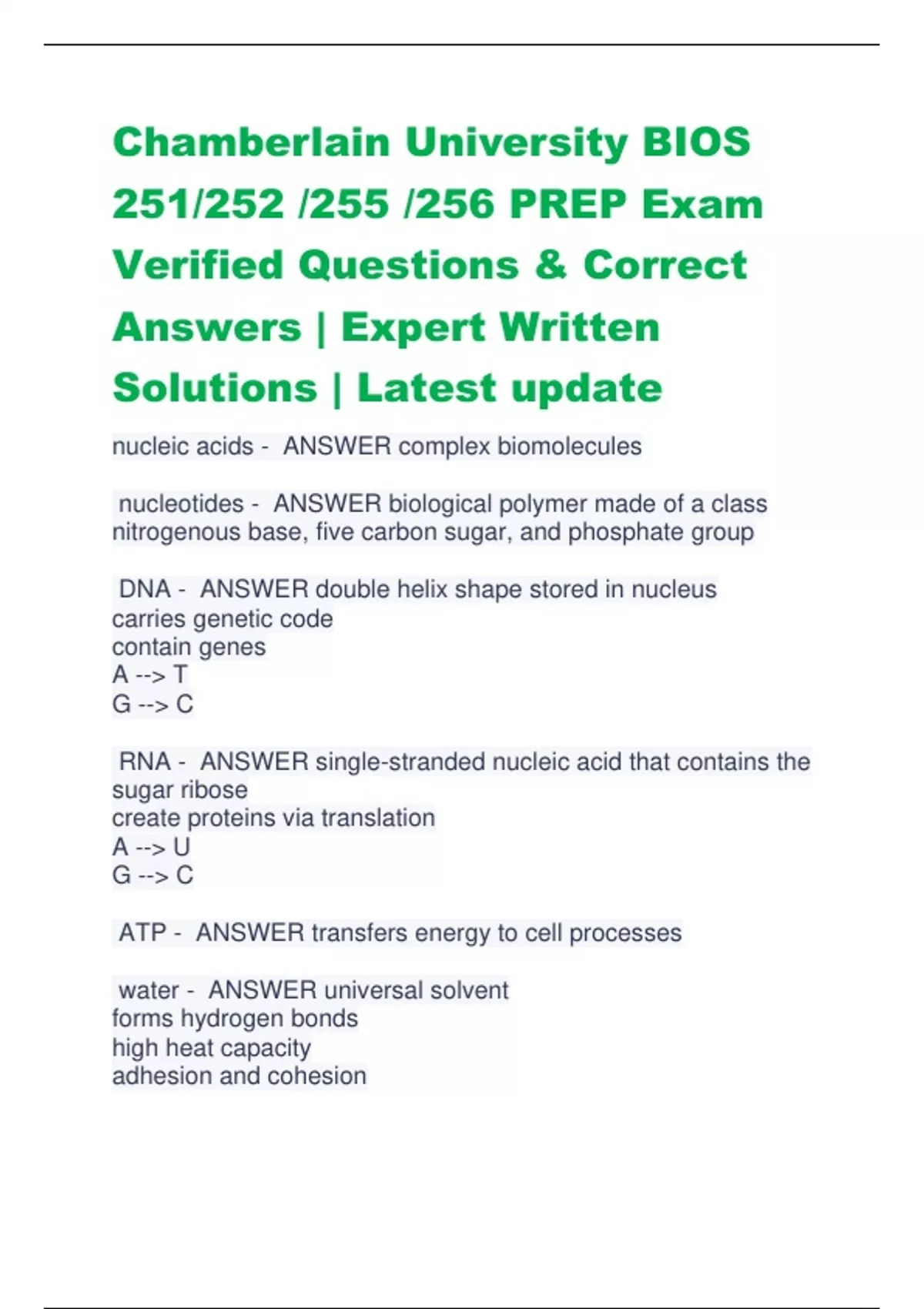 Chamberlain University BIOS 251/252 /255 /256 PREP Exam Verified Questions & Correct Answers | Expert Written Solutions | Latest update nucleic acids - ANSWER complex biomolecules nucleotides - ANSWER biological polymer made of a class nitrogenous base, five carbon sugar, and phosphate group DNA - ANSWER double helix shape stored in nucleus carries genetic code contain genes A --> T G --> C RNA - ANSWER single-stranded nucleic acid that contains the sugar ribose create proteins via translation A --> U G --> C ATP - ANSWER transfers energy to cell processes water - ANSWER universal solvent forms hydrogen bonds high heat capacity adhesion and cohesion cohesion - ANSWER attracted to other water molecules adhesion - ANSWER able to stick to nearby molecules catabolism - ANSWER Metabolic pathways that break down molecules, releasing energy exergonic anabolism - ANSWER Metabolic pathways that construct molecules, requiring energy endergonic hydrolysis - ANSWER consuming a water molecule to break a covalent bond dehydration - ANSWER creating a new covalent bond between two monomers and producing water as a by-product subatomic particles and charges - ANSWER proton (+), neutron (0), electron (-) atomic weight - ANSWER average mass of an atom of that element atomic number - ANSWER number of protons in an atom mass number - ANSWER total number of protons and neutrons ions - ANSWER atoms/ molecules with an electrical charge isotopes - ANSWER Atoms with the same number of protons but different numbers of neutrons covalent bonding - ANSWER sharing of electrons (between nonmetals) hydrogen bonding - ANSWER water molecules reacting with each other ionic bonding - ANSWER form between cations and anions between non metals and metals metals - ANSWER seek to lose electrons nonmetals - ANSWER seek to gain electrons polar covalent bonds - ANSWER when one atom has a higher affinity for electrons; electrons are shared unequally nonpolar covalent bond - ANSWER similar electron affinity; electrons shared equally