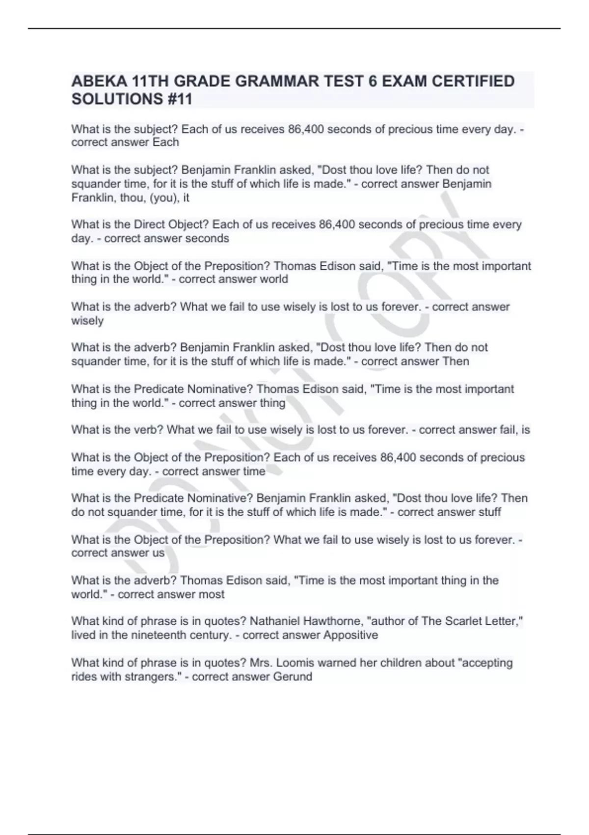 ABEKA 11TH GRADE GRAMMAR TEST 6 EXAM CERTIFIED SOLUTIONS #11