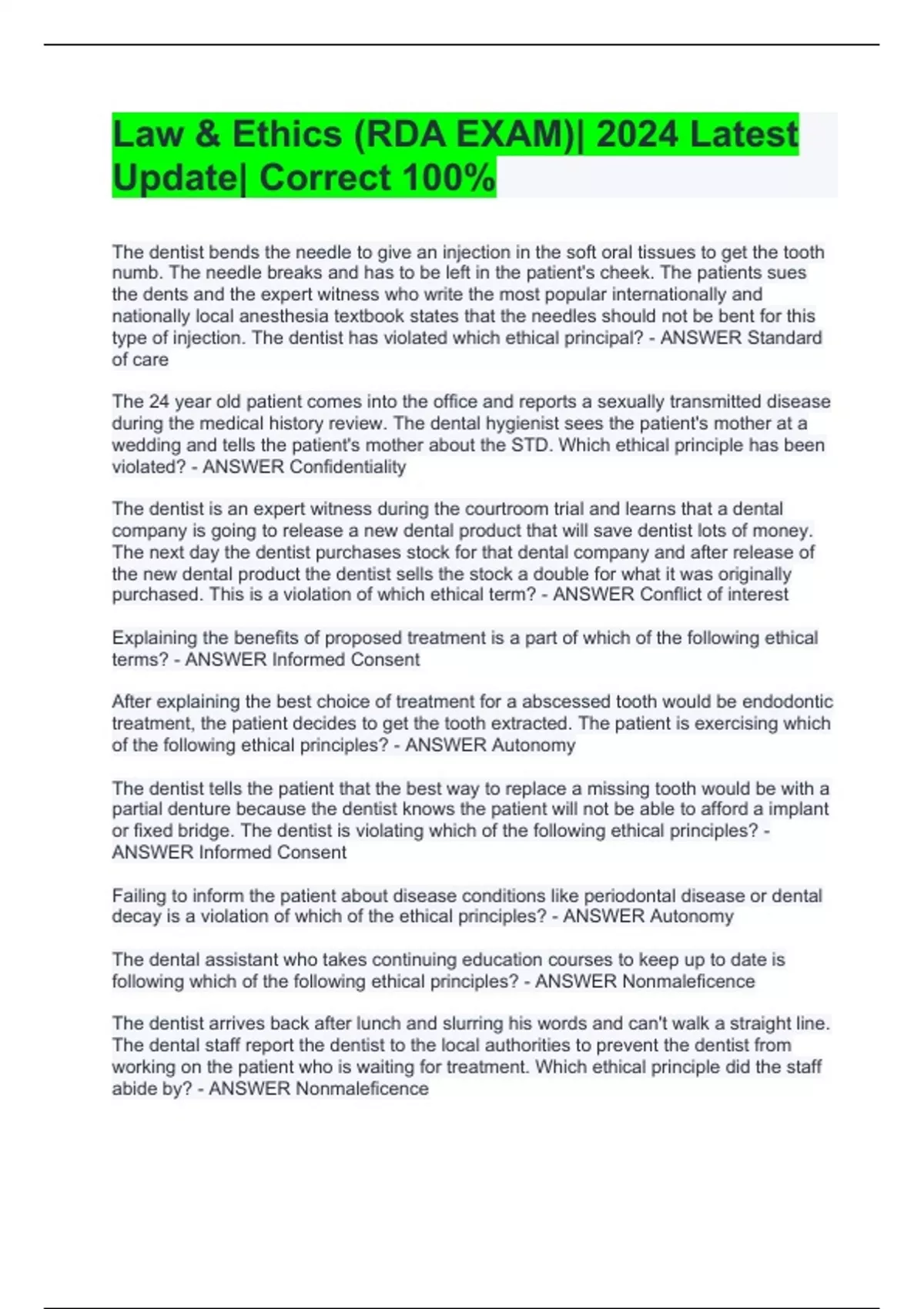 The dentist bends the needle to give an injection in the soft oral tissues to get the tooth numb. The needle breaks and has to be left in the patient's cheek. The patients sues the dents and the expert witness who write the most popular internationally and nationally local anesthesia textbook states that the needles should not be bent for this type of injection. The dentist has violated which ethical principal? - ANSWER Standard of care The 24 year old patient comes into the office and reports a sexually transmitted disease during the medical history review. The dental hygienist sees the patient's mother at a wedding and tells the patient's mother about the STD. Which ethical principle has been violated? - ANSWER Confidentiality The dentist is an expert witness during the courtroom trial and learns that a dental company is going to release a new dental product that will save dentist lots of money. The next day the dentist purchases stock for that dental company and after release of the new dental product the dentist sells the stock a double for what it was originally purchased. This is a violation of which ethical term? - ANSWER Conflict of interest Explaining the benefits of proposed treatment is a part of which of the following ethical terms? - ANSWER Informed Consent After explaining the best choice of treatment for a abscessed tooth would be endodontic treatment, the patient decides to get the tooth extracted. The patient is exercising which of the following ethical principles? - ANSWER Autonomy The dentist tells the patient that the best way to replace a missing tooth would be with a partial denture because the dentist knows the patient will not be able to afford a implant or fixed bridge. The dentist is violating which of the following ethical principles? - ANSWER Informed Consent Failing to inform the patient about disease conditions like periodontal disease or dental decay is a violation of which of the ethical principles? - ANSWER Autonomy The dental assistant who takes continuing education courses to keep up to date is following which of the following ethical principles? - ANSWER Nonmaleficence