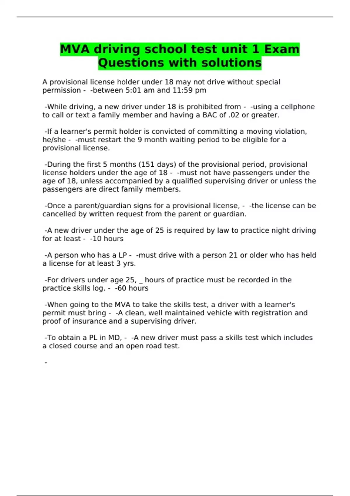 MVA driving school test unit 1 Exam