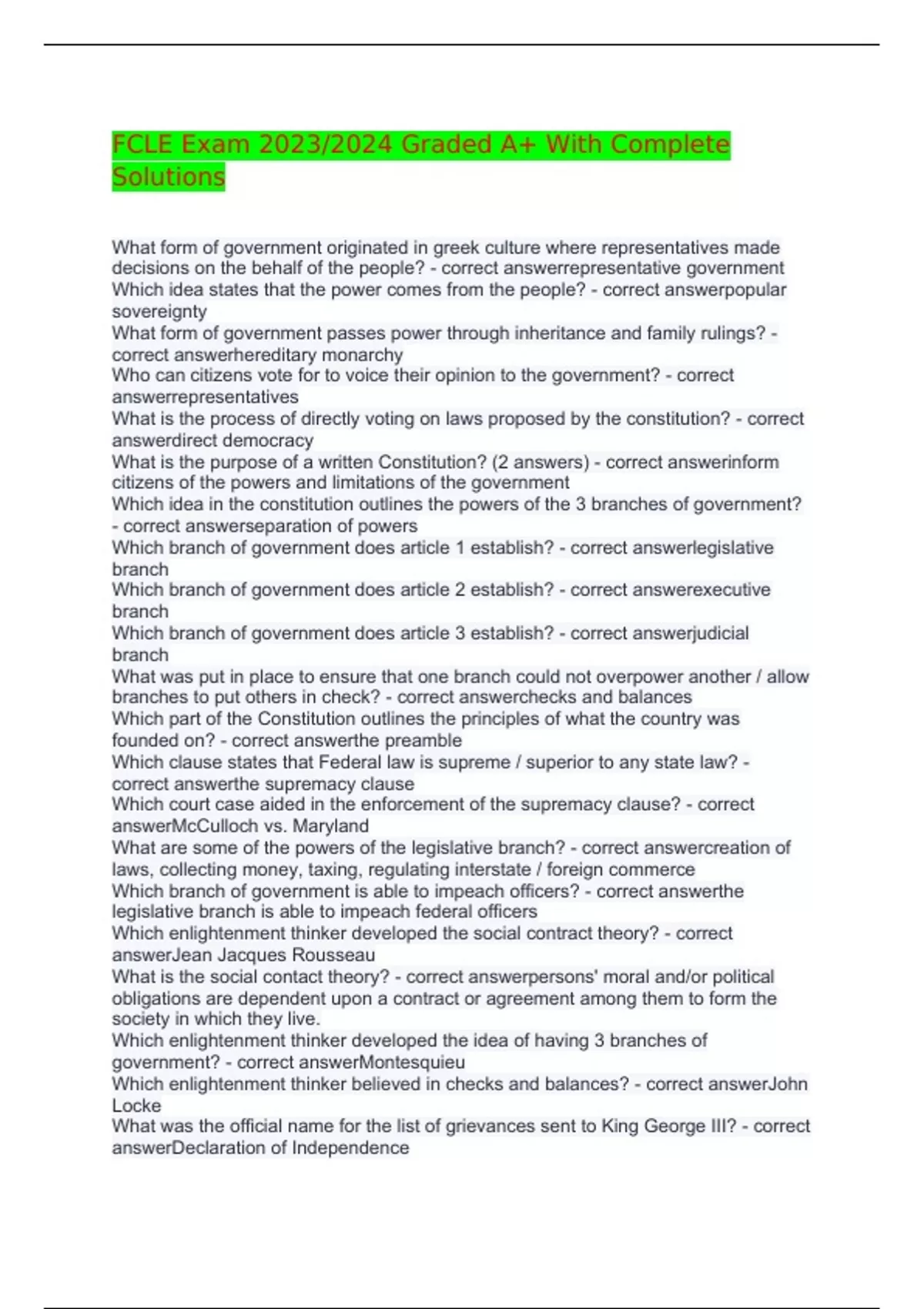 FCLE Exam 2023/2024 Graded A+ With Complete Solutions What form of government originated in greek culture where representatives made decisions on the behalf of the people? - correct answerrepresentative government Which idea states that the power comes from the people? - correct answerpopular sovereignty What form of government passes power through inheritance and family rulings? - correct answerhereditary monarchy Who can citizens vote for to voice their opinion to the government? - correct answerrepresentatives What is the process of directly voting on laws proposed by the constitution? - correct answerdirect democracy What is the purpose of a written Constitution? (2 answers) - correct answerinform citizens of the powers and limitations of the government Which idea in the constitution outlines the powers of the 3 branches of government? - correct answerseparation of powers Which branch of government does article 1 establish? - correct answerlegislative branch Which branch of government does article 2 establish? - correct answerexecutive branch Which branch of government does article 3 establish? - correct answerjudicial branch What was put in place to ensure that one branch could not overpower another / allow branches to put others in check? - correct answerchecks and balances Which part of the Constitution outlines the principles of what the country was founded on? - correct answerthe preamble Which clause states that Federal law is supreme / superior to any state law? - correct answerthe supremacy clause Which court case aided in the enforcement of the supremacy clause? - correct answerMcCulloch vs. Maryland What are some of the powers of the legislative branch? - correct answercreation of laws, collecting money, taxing, regulating interstate / foreign commerce Which branch of government is able to impeach officers? - correct answerthe legislative branch is able to impeach federal officers Which enlightenment thinker developed the social contract theory? - correct answerJean Jacques Rousseau What is the social contact theory? - correct answerpersons' moral and/or political obligations are dependent upon a contract or agreement among them to form the society in which they live. Which enlightenment thinker developed the idea of having 3 branches of government? - correct answerMontesquieu Which enlightenment thinker believed in checks and balances? - correct answerJohn Locke What was the official name for the list of grievances sent to King George III? - correct answerDeclaration of Independence Which documents inspired the US constitution? (3 answers) - correct answerThe Magna Carta, Declaration of Independence, and Articles of Confederation