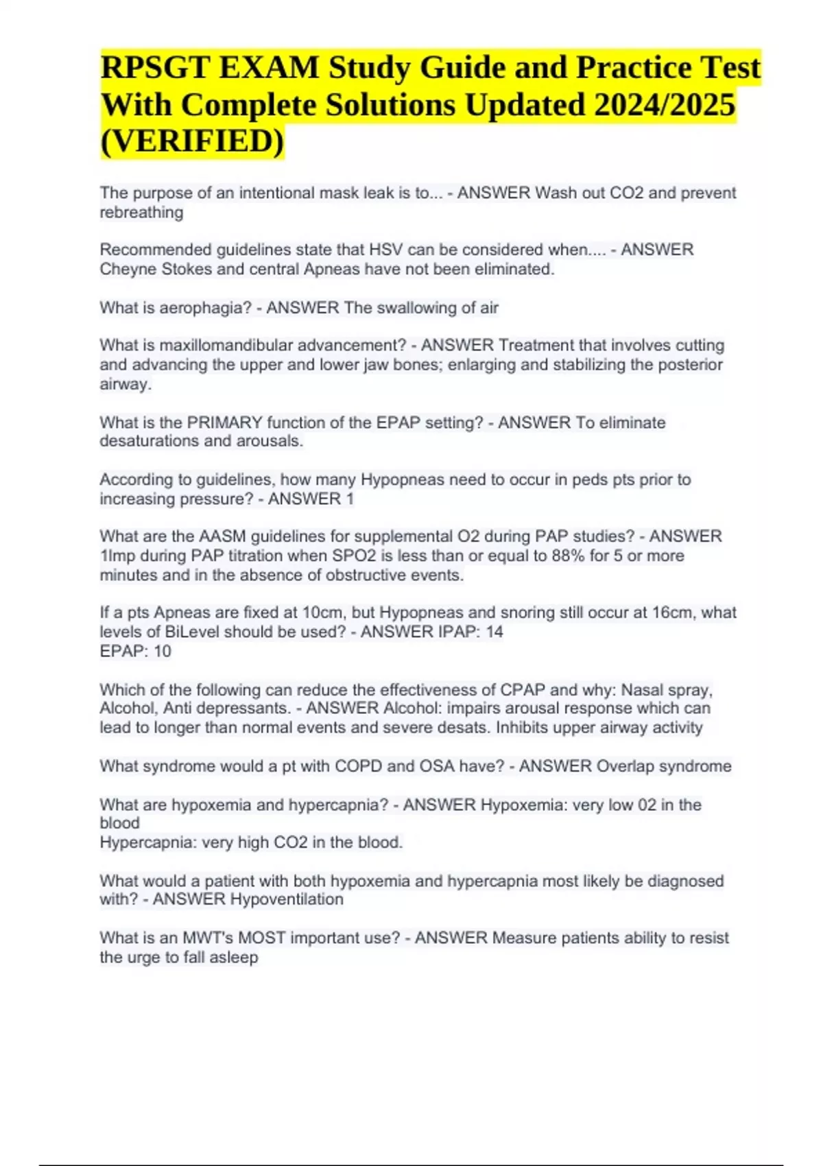 RPSGT EXAM Study Guide, Practice Test Questions With Complete Solutions Updated 2024/2025 (VERIFIED)