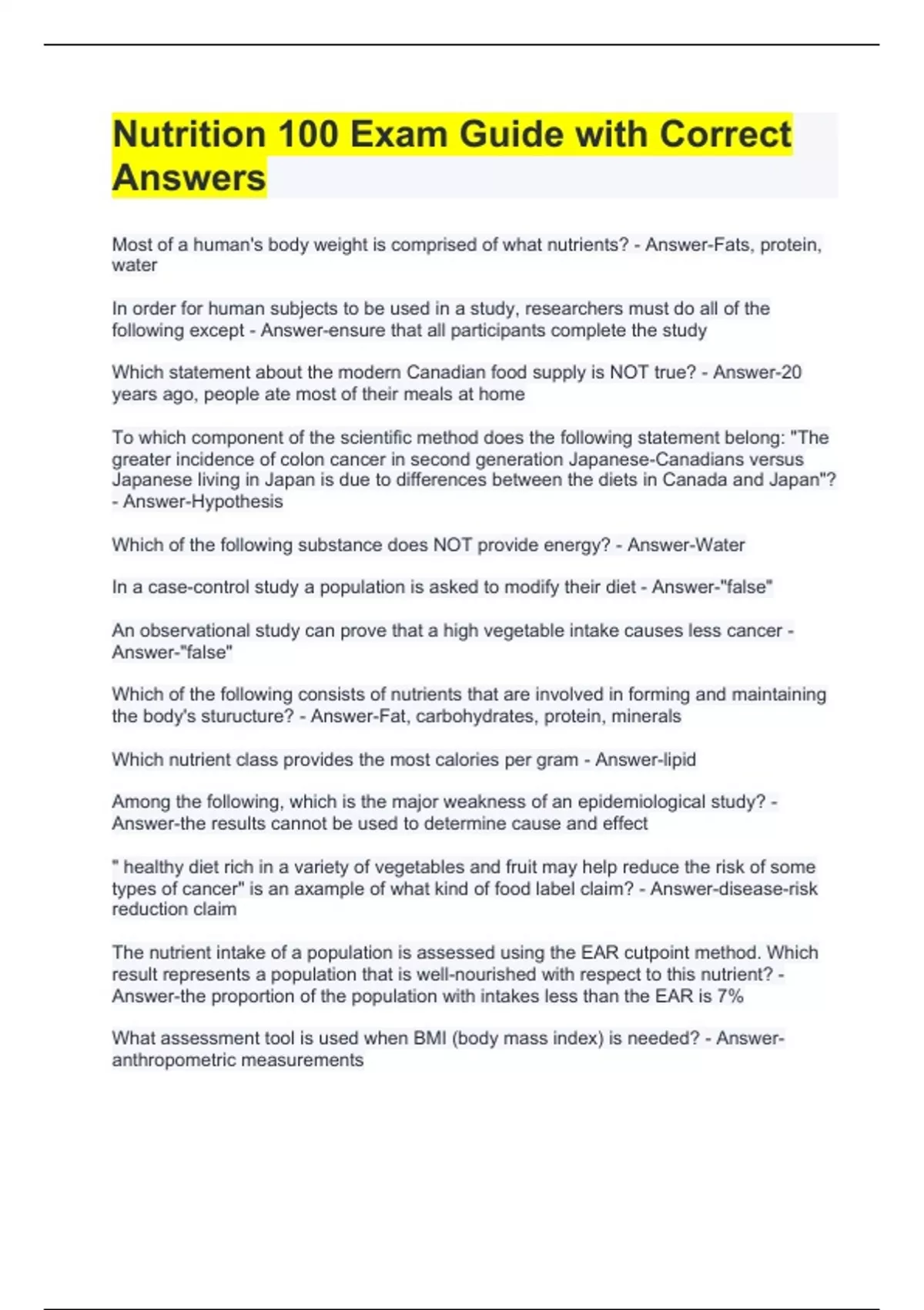 Most of a human's body weight is comprised of what nutrients? - Answer-Fats, protein, water In order for human subjects to be used in a study, researchers must do all of the following except - Answer-ensure that all participants complete the study Which statement about the modern Canadian food supply is NOT true? - Answer-20 years ago, people ate most of their meals at home To which component of the scientific method does the following statement belong: "The greater incidence of colon cancer in second generation Japanese-Canadians versus Japanese living in Japan is due to differences between the diets in Canada and Japan"? - Answer-Hypothesis Which of the following substance does NOT provide energy? - Answer-Water In a case-control study a population is asked to modify their diet - Answer-"false" An observational study can prove that a high vegetable intake causes less cancer - Answer-"false" Which of the following consists of nutrients that are involved in forming and maintaining the body's sturucture? - Answer-Fat, carbohydrates, protein, minerals Which nutrient class provides the most calories per gram - Answer-lipid Among the following, which is the major weakness of an epidemiological study? - Answer-the results cannot be used to determine cause and effect " healthy diet rich in a variety of vegetables and fruit may help reduce the risk of some types of cancer" is an axample of what kind of food label claim? - Answer-disease-risk reduction claim The nutrient intake of a population is assessed using the EAR cutpoint method. Which result represents a population that is well-nourished with respect to this nutrient? - Answer-the proportion of the population with intakes less than the EAR is 7% What assessment tool is used when BMI (body mass index) is needed? - Answer-anthropometric measurements